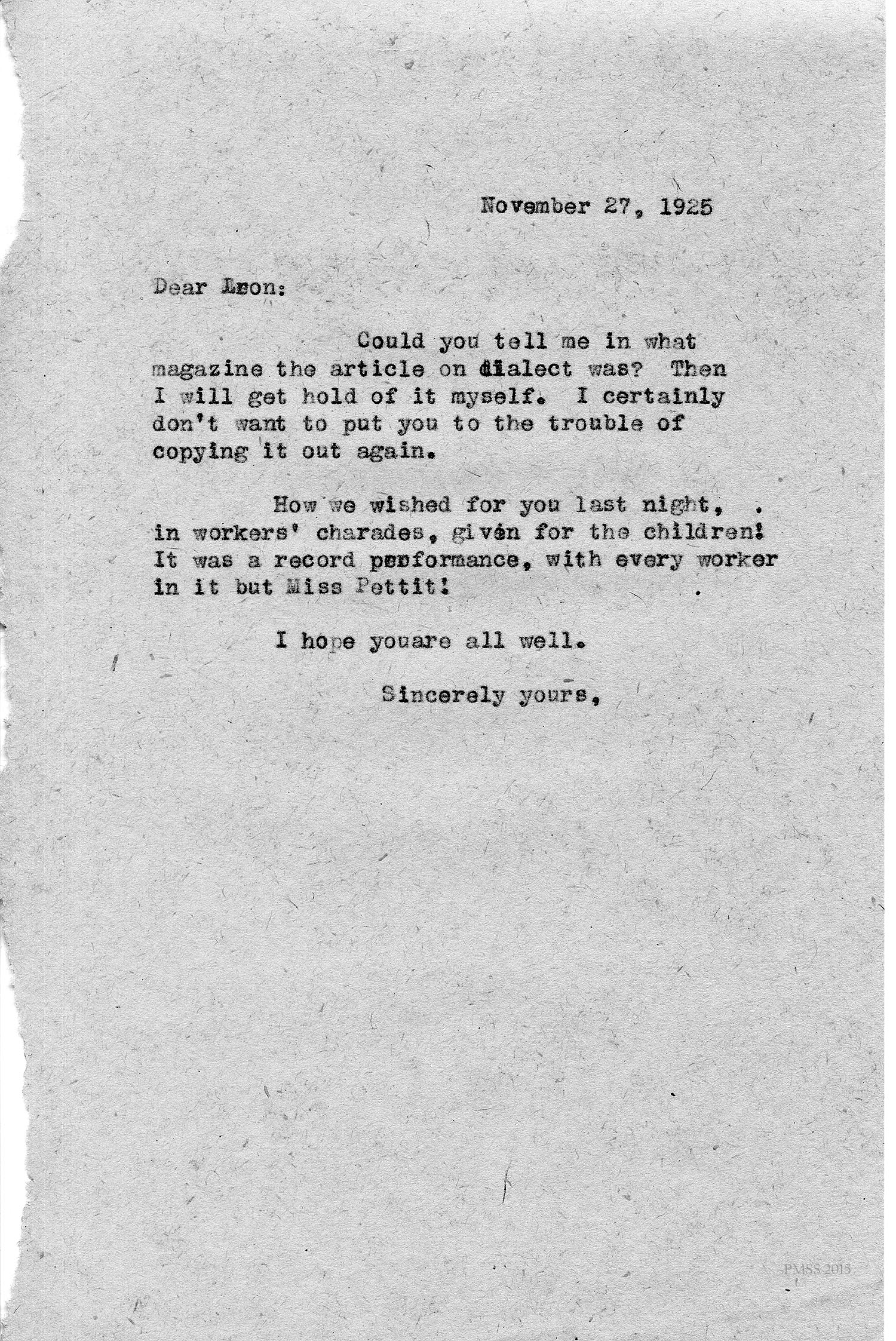 [unsigned] to “Leon”: article on dialect; workers’ charades.