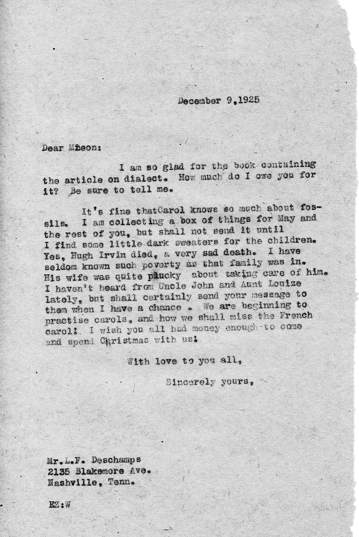 [unsigned] “EZ” (Ethel Zande) to “Leon”: Article on dialect; will send box of things for family; Hugh Irvin died; Uncle John & Aunt Louise; carols.1926 & 1927