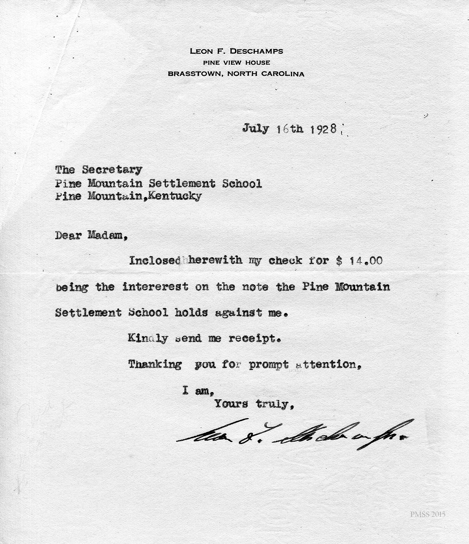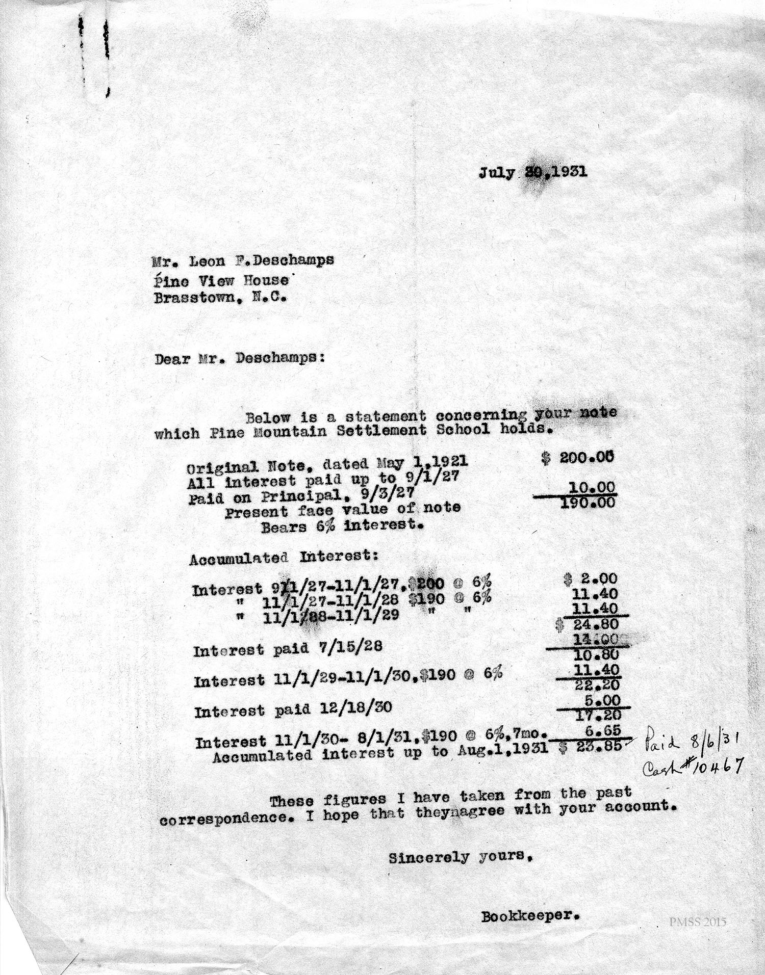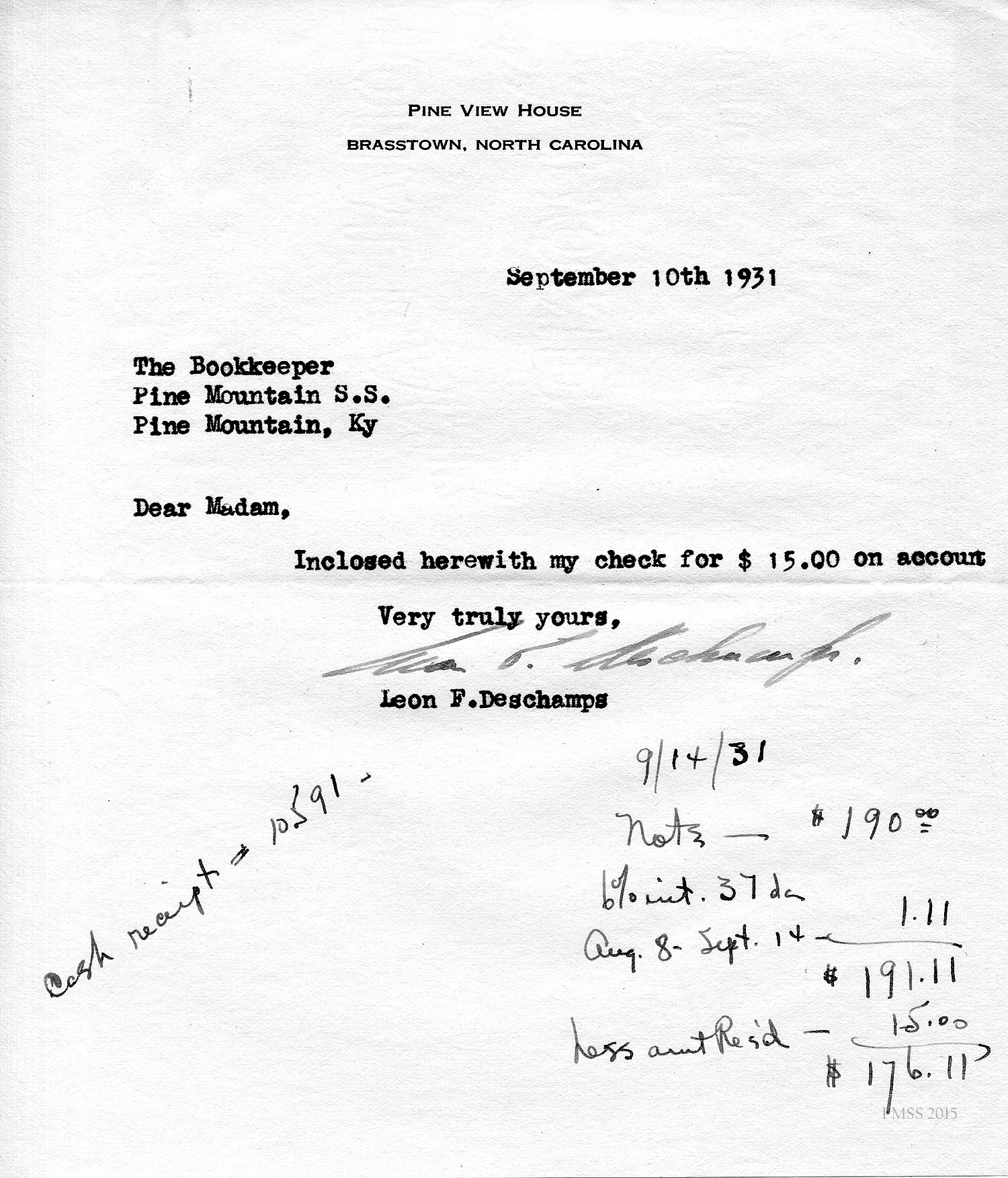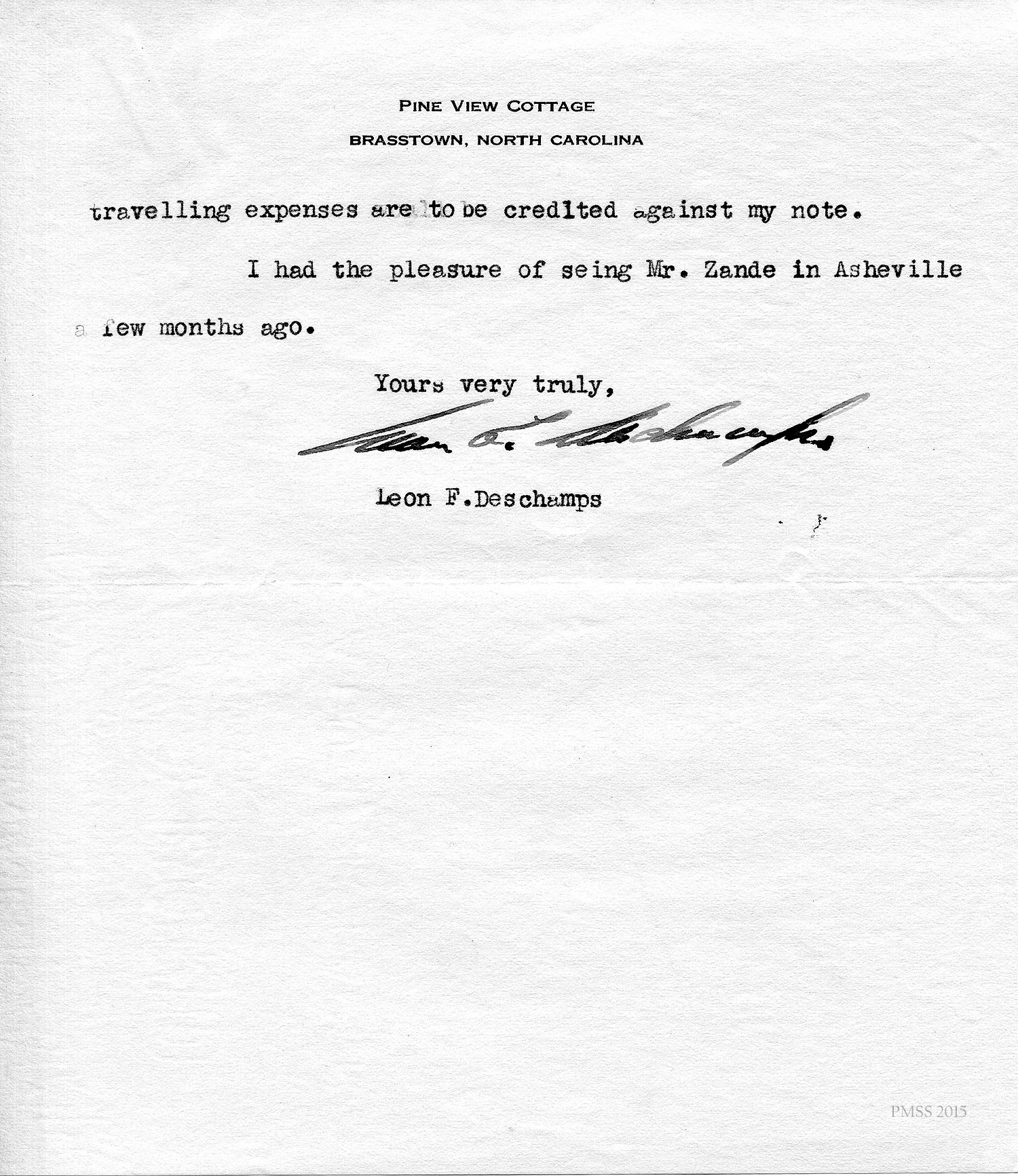 Deschamps in Brasstown, NC, to Zande: Describes his plans to pay on his debt; Luigi’s letter; Zande’s health; [handwritten notations on this letter indicates payments and balances].