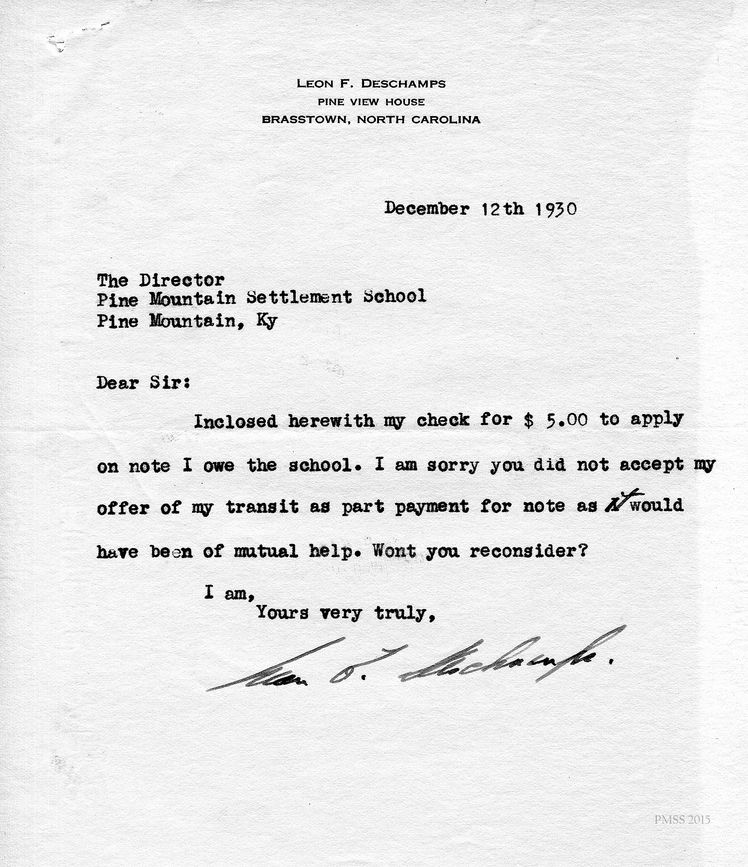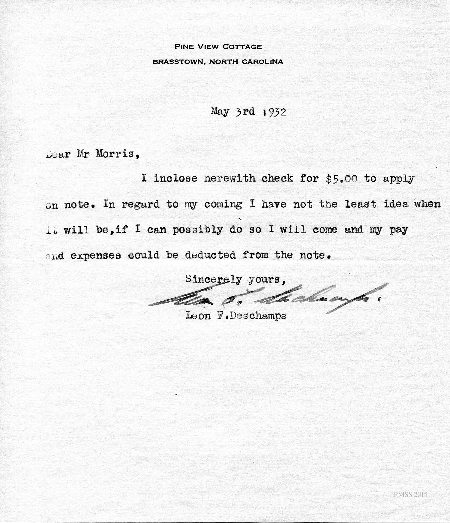 [unsigned] “EZ” (Ethel Zande) to “Leon”: Asks Deschamps to pay towards his loan from PMSS; Granny Creech.