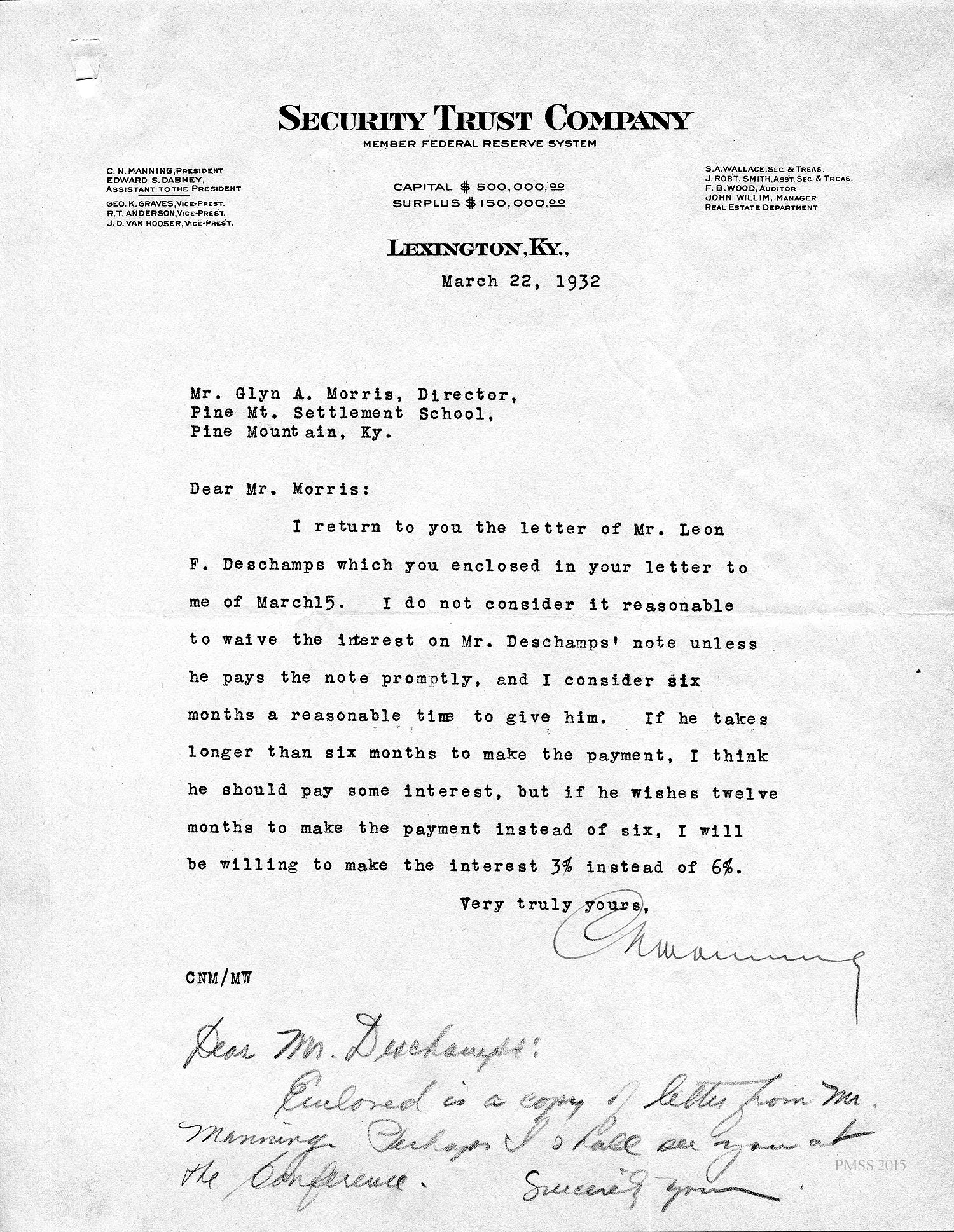 [unsigned] to Leon Deschamps in Lexington, KY: Cannot find Leon’s papers in the vault; Miss [Bessie V.] Gaunt is away; ask Mr. [Charles N.] Manning.