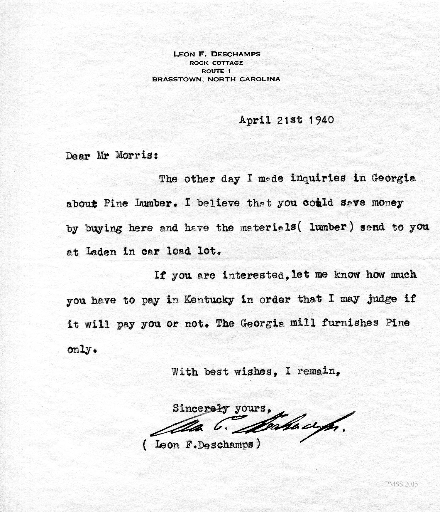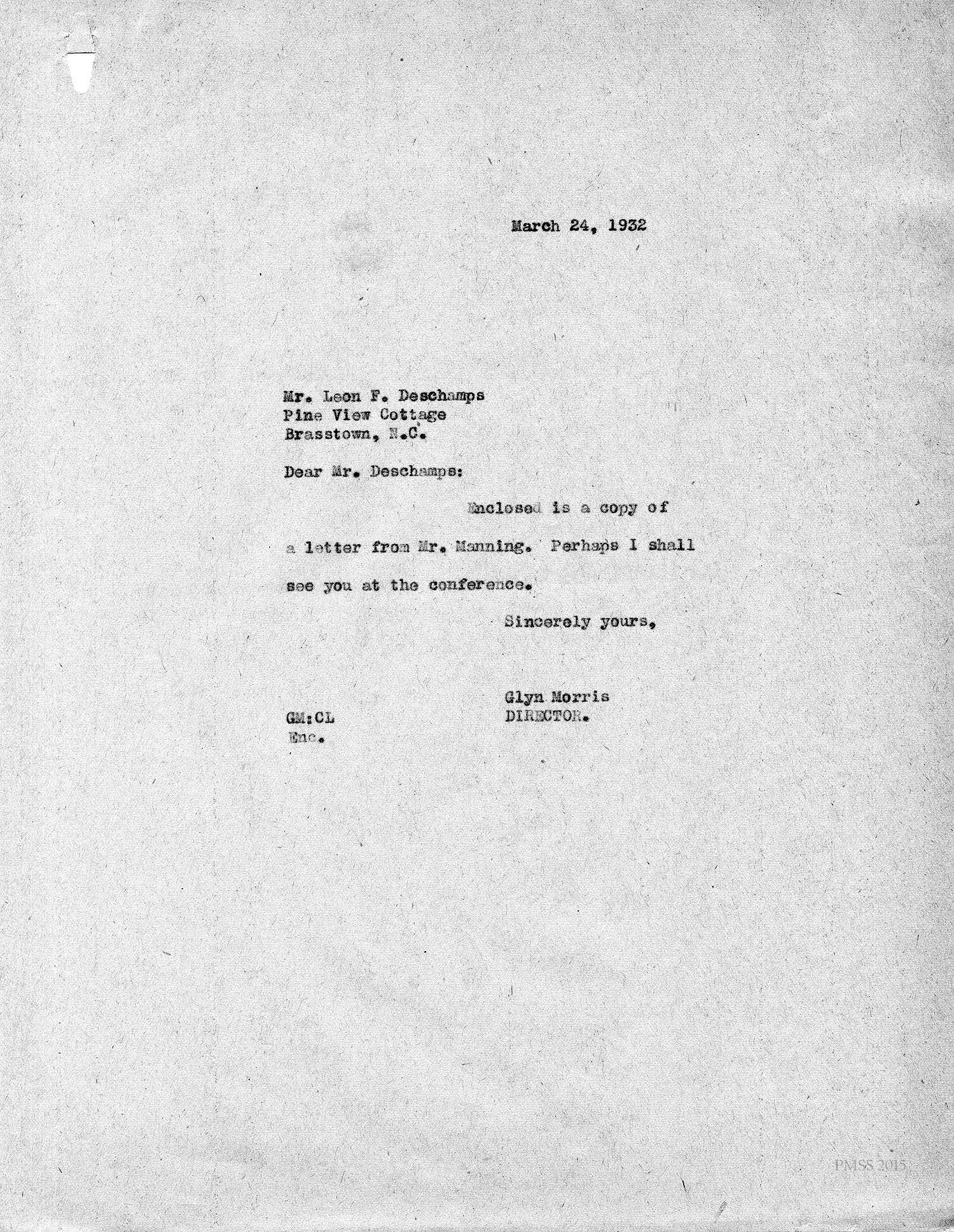 Deschamps in Swannanoa, NC, to “The Director” at PMSS: Asks for a copy of the PMSS calendar.