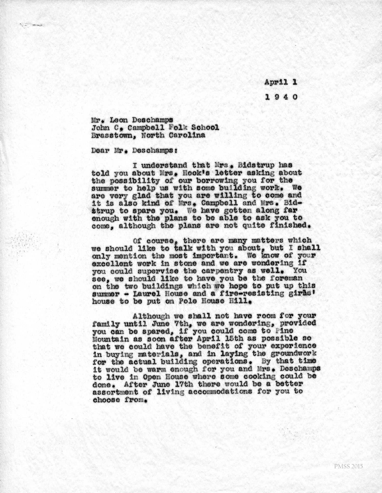 Deschamps in Brasstown, NC [no salutation]: community building; Mrs. Campbell; Mr. and Mrs. Lange; John C. Campbell Folk School.