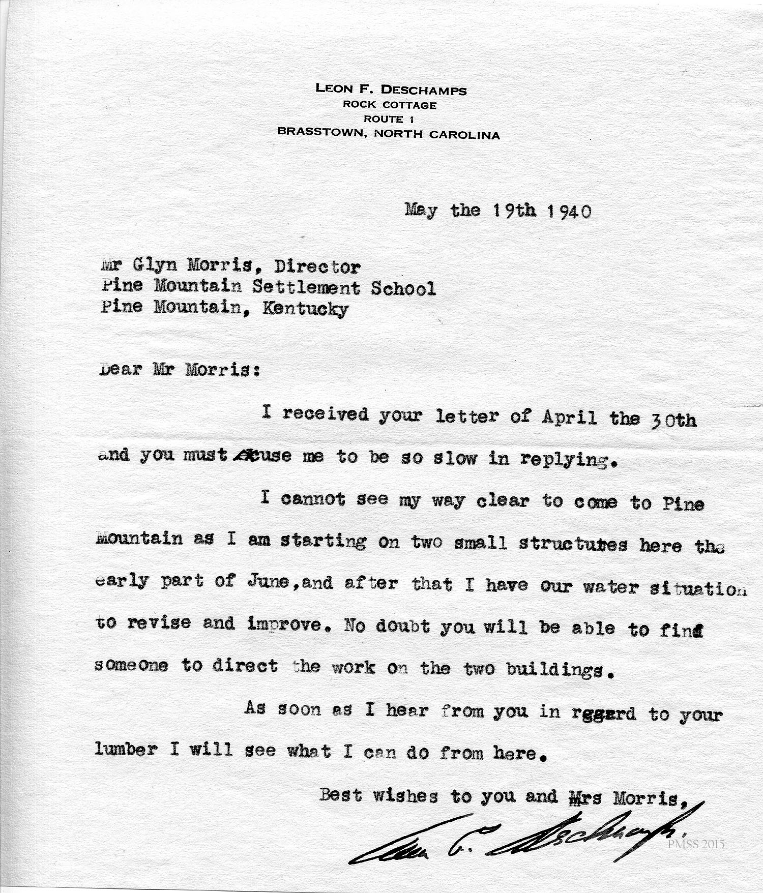 Deschamps to Morris: Too busy at Campbell Folk School to come to Pine Mountain.