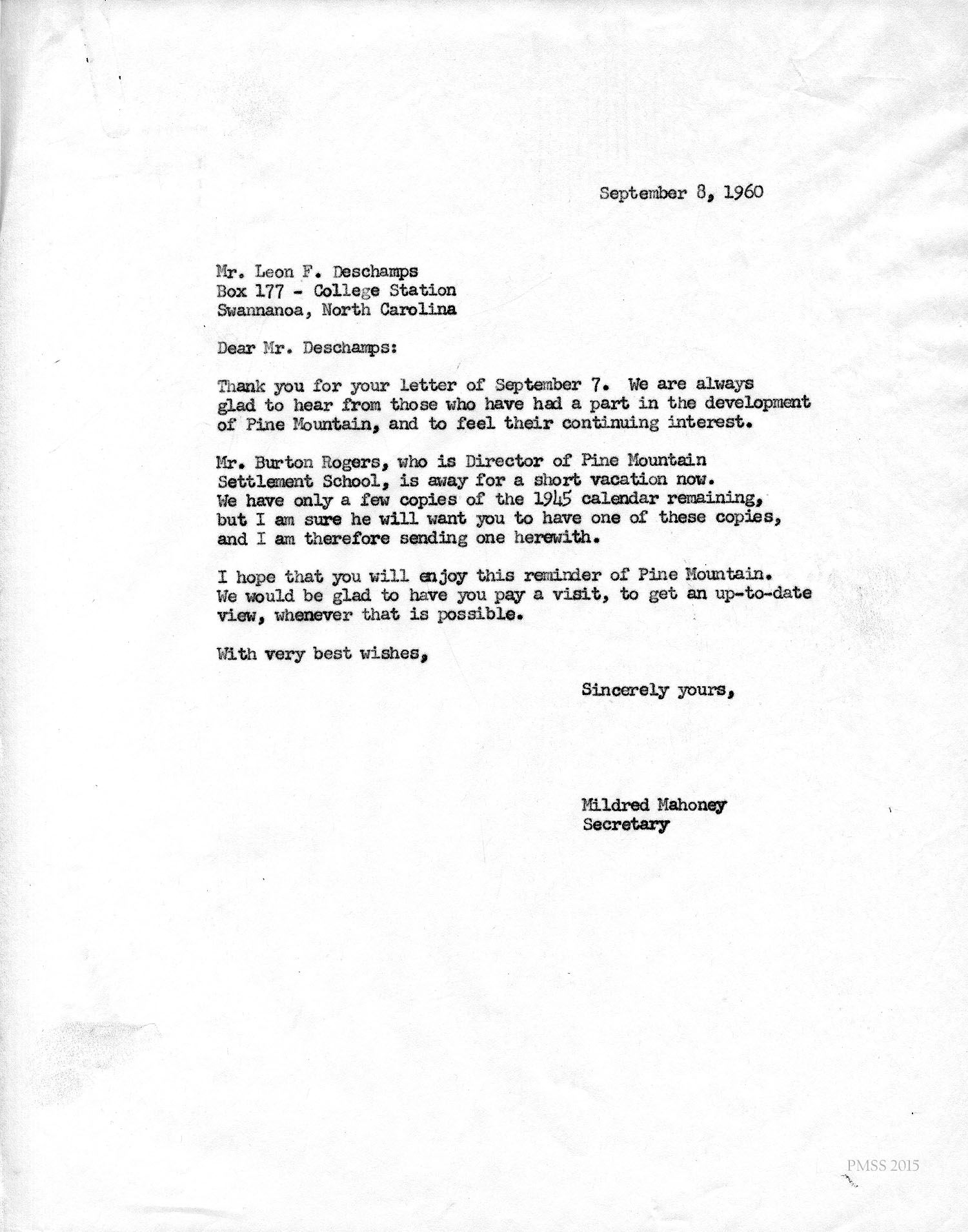 Mildred Mahoney, PMSS Secretary, to Deschamps: Will send 1954 calendar; Burton Rogers is on vacation; invites Deschamps to visit PMSS.