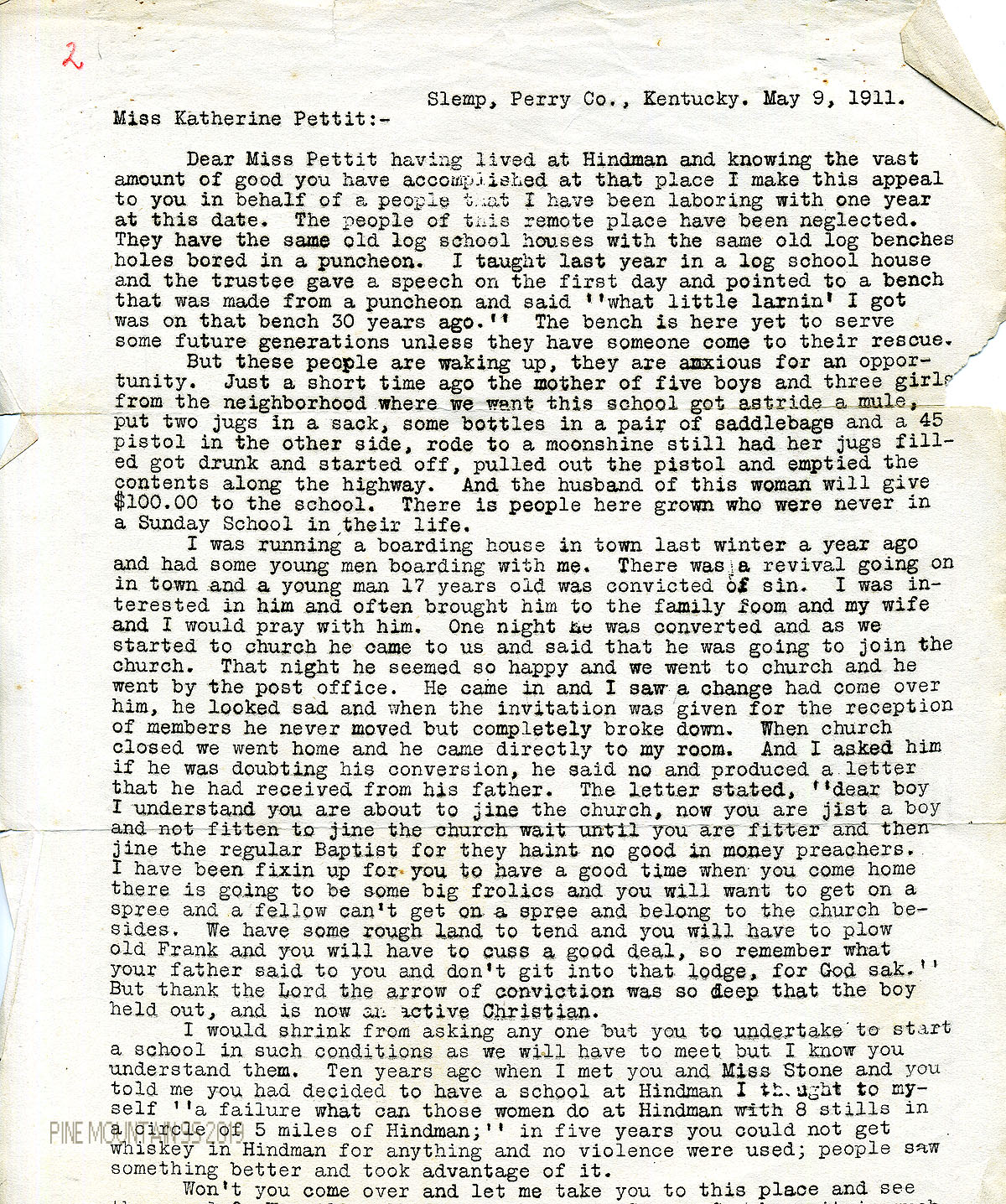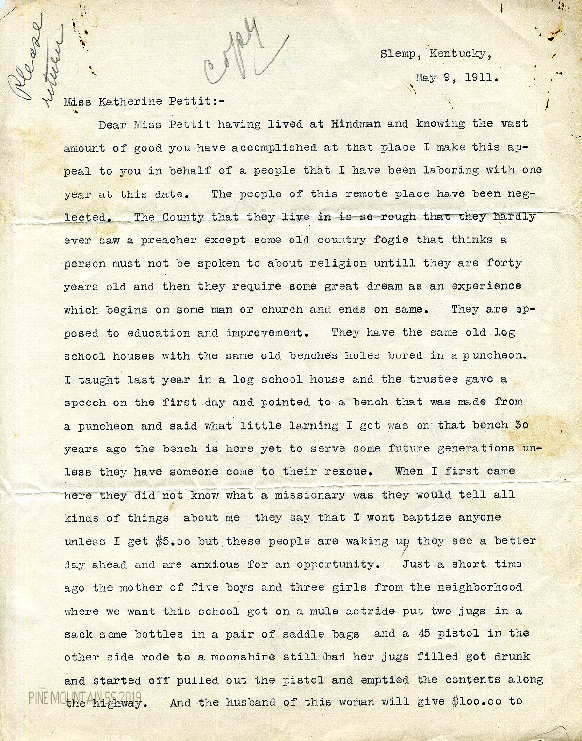 Dear Miss Pettit: Having been connected some with your work at [penciled notation: lived at] Hindman and knowing the vast amount of good you have accomplished at that place, I make this appeal to you in behal[f] of a people that I have been laboring with one year at this date.