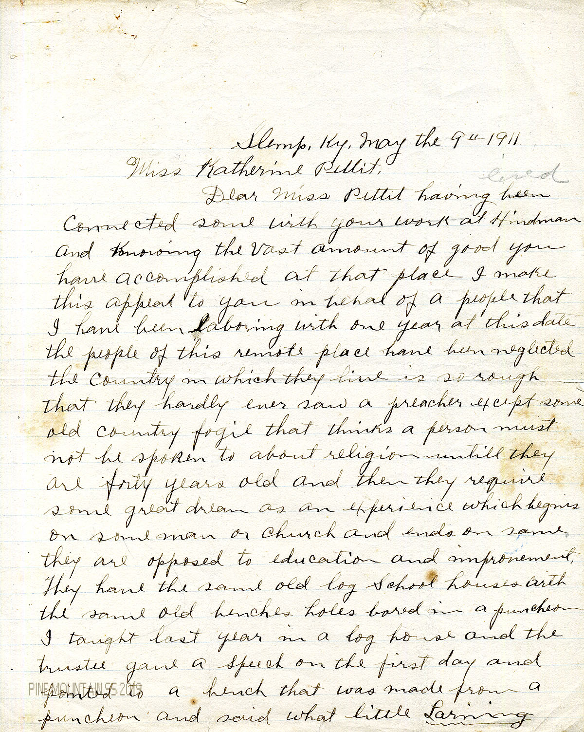 In the early 1900s, Rev. Lewis Lyttle served as a liaison between Katherine Pettit and the community to find those who would donate suitable land on which to build a new settlement school. When Lyttle wrote the following letters, the idea of a school in the Pine Mountain Valley was just beginning to form in the minds of Lyttle and Pettit. The timing was fortuitous and both Lyttle and Pettit began to energetically work toward making the vision a reality.
