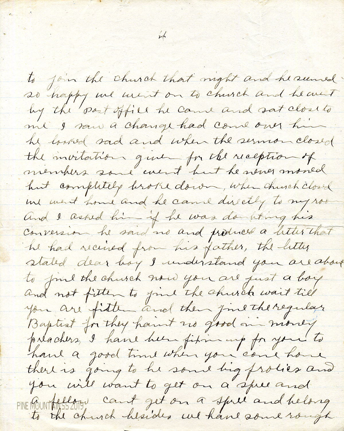 …to join the church that night and he seemed so happy. We went on to church and he went by the post office. He came and sat close to me. I saw a change had come over him. He looked sad and when the sermon closed the invitation [was] given for the reception of members. Some went but he never moved but completely broke down. When church closed we went home and he came directly to my room and I asked him if he was doubting his conversion. He said no and produced a letter that he had received from his father. The letter stated: “Dear boy, I understand you are about to jine (sic) the church now. You are just a boy and not fifteen to jine the church. wait till you are fifteen and then jine the regular Baptist for they haint no good in money preachers. I have been fixin up for you to have a good time when you come home. There is going to be some big frolics and you will want to get on a spree and a feller can’t get on a spree and belong to the church. Besides, we have some rough…