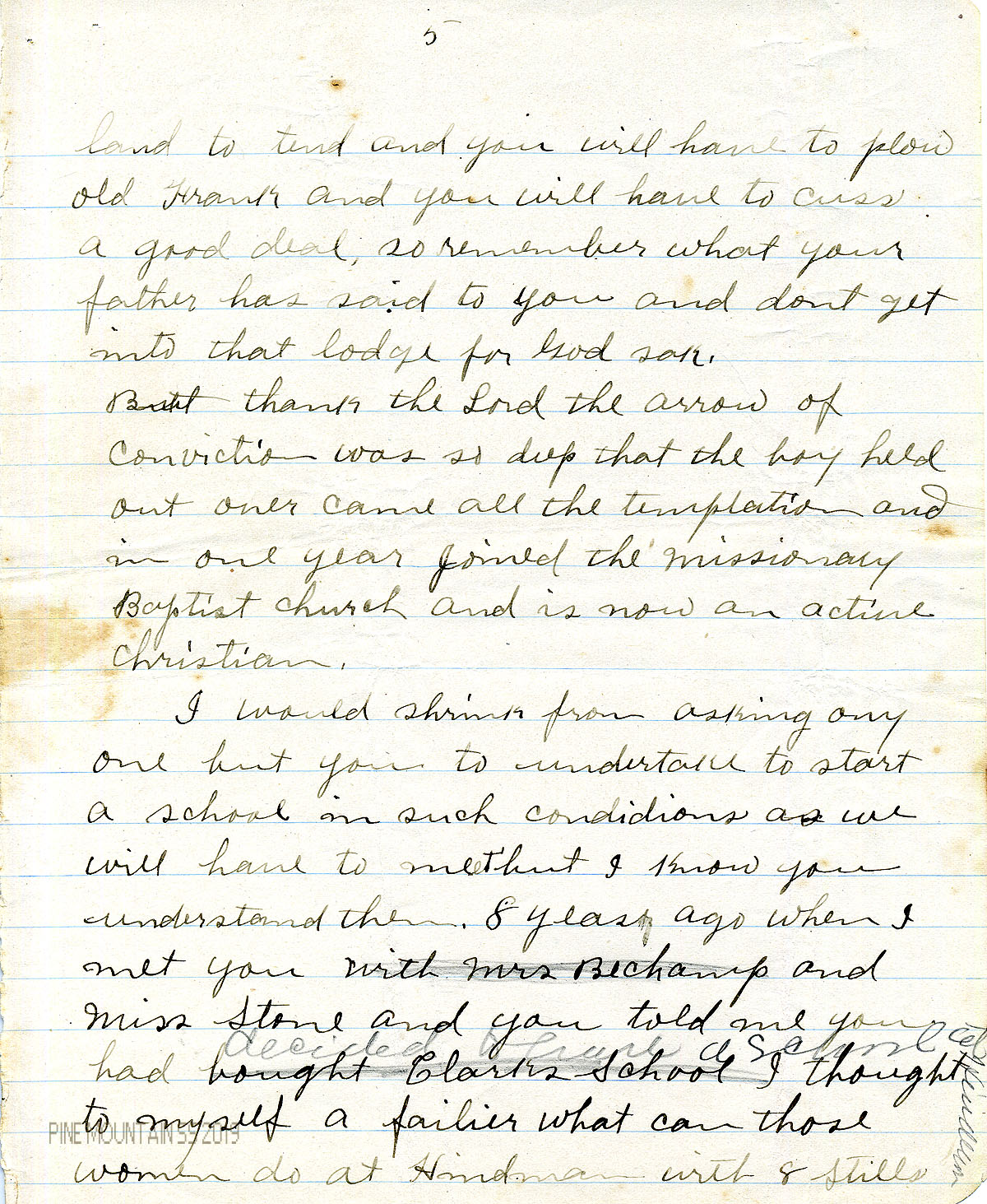 Now if there was ever a place that needs a school and Christian training it is that country. It is about 12 miles from the R.R., the wagon road, about six over the Pine Mt. by footpath. I can’t tell you all I would like about this place but if you will come I will go with you any time. I preach there the 4th Sunday in this month. If you could come and go with me then I would be glad. If you can’t come then let me know when you can come and I will let them know at that time so the people can all be there when you do come.