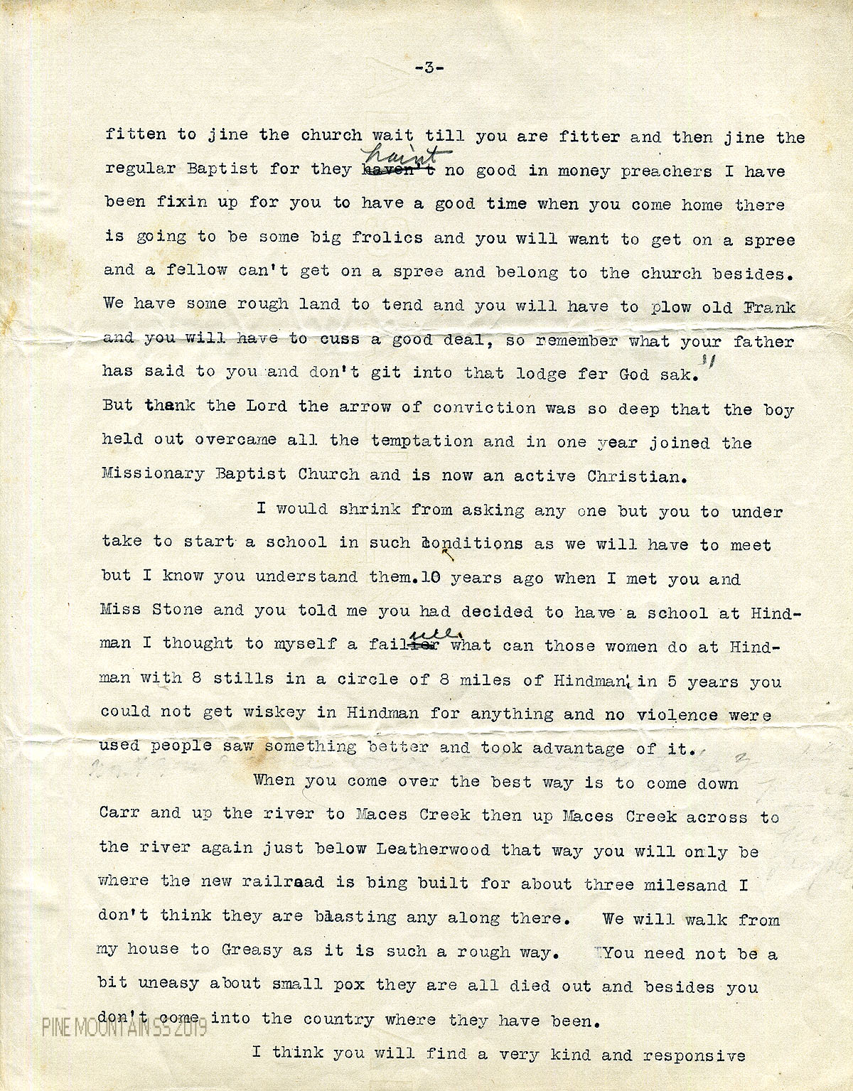 I would shrink from asking anyone but you to undertake to start a School in such conditions as we will have to meet but I know you understand them. 8 [change to “ten” in transcription] years ago when I met you with Mrs. Dechamp and Miss Stone and you told me you bought Clarks School [penciled notation: had decided to have a school at Hindman,] I thought to myself , “A failure. What can those women do at Hindman with 8 stills…