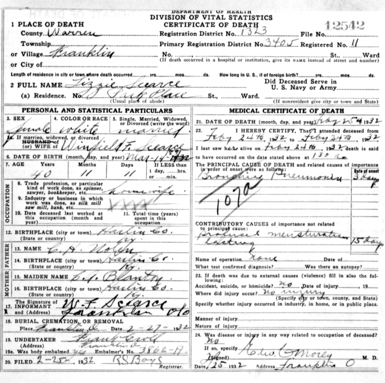 - Lizzie (Nolan) Metcalf Scearce, (1891-1932). Death Certificate. [pmss_metcalf_lizziescearce.jpg]