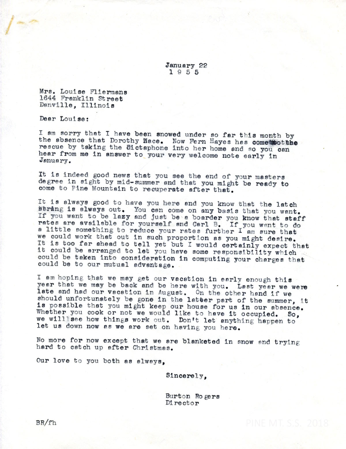 061 January 22, 1955. To Mrs. Louise Fliermans, Danville, IL, from PMSS Director Burton Rogers, who mentions that in Dorothy Nace’s absence, Fern Hayes is transcribing from the Dictaphone. He welcomes her to visit PMSS anytime at staff rates to rest or do PMSS work. Suggests she might keep the Rogers’ house when they are on vacation.
