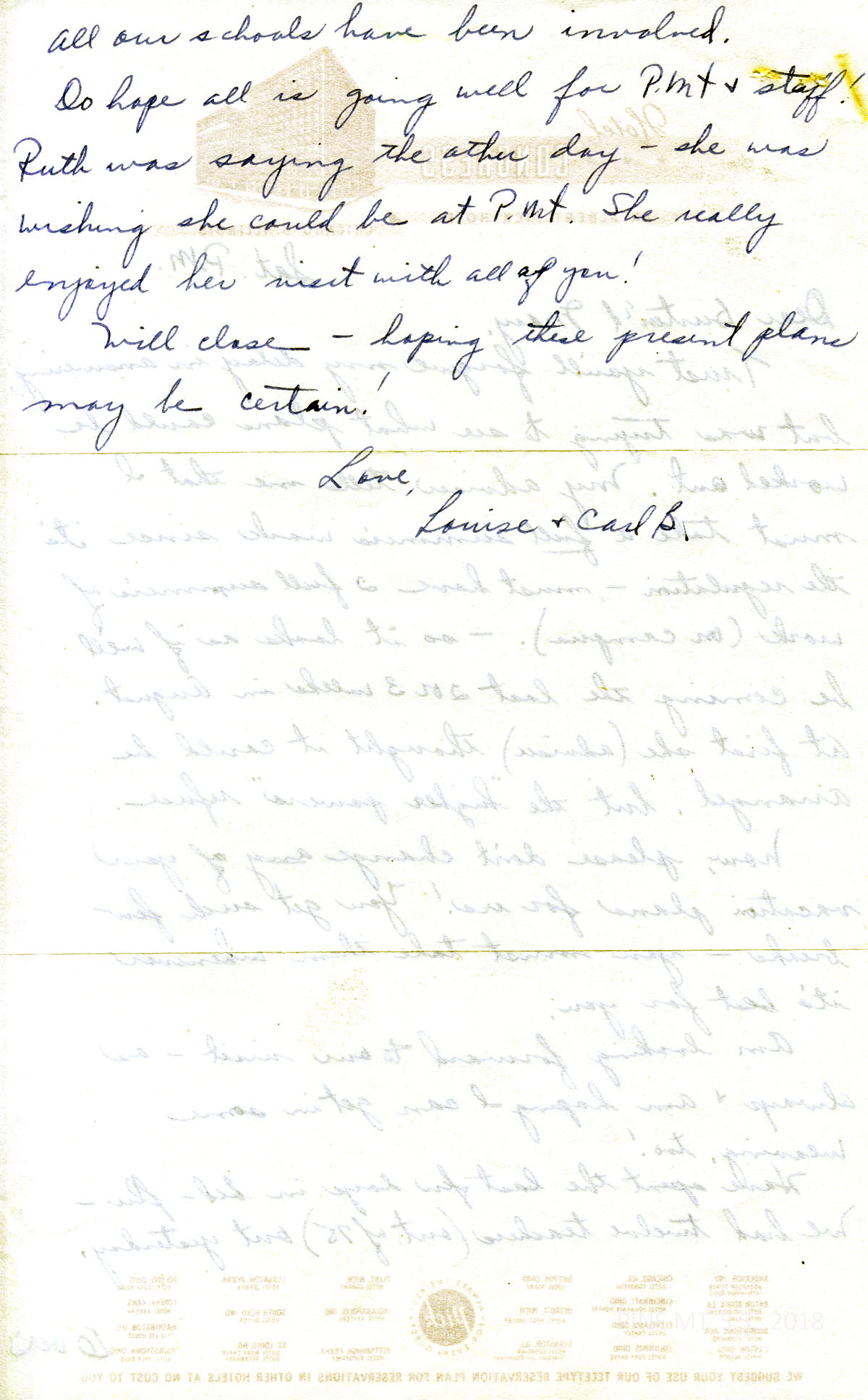 062-062a N.D. Two-page letter to Burton and Mary Rogers from Fliermans on letterhead from Hotel Congress, Chicago, IL. She will have to take a full summer of study, so she will visit PMSS at the end of August. She and many others are sick with the flu.