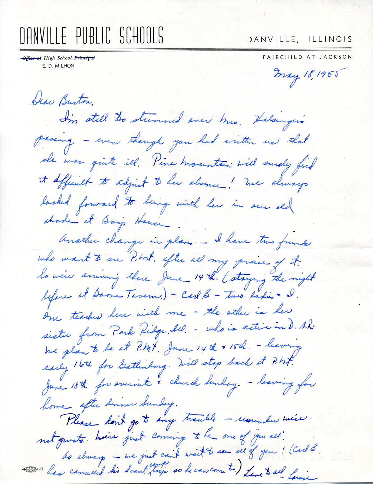 064 May 18, 1955. To Rogers from Fliermans. “I’m still too stunned over Mrs.Mrs. Mrs. Holsinger’s passing…We always looked forward to being with her in our old abode at Boy’s House.” Fliermans states her travel plans and that she will be bringing Carl B, and two friends with her to PMSS.
