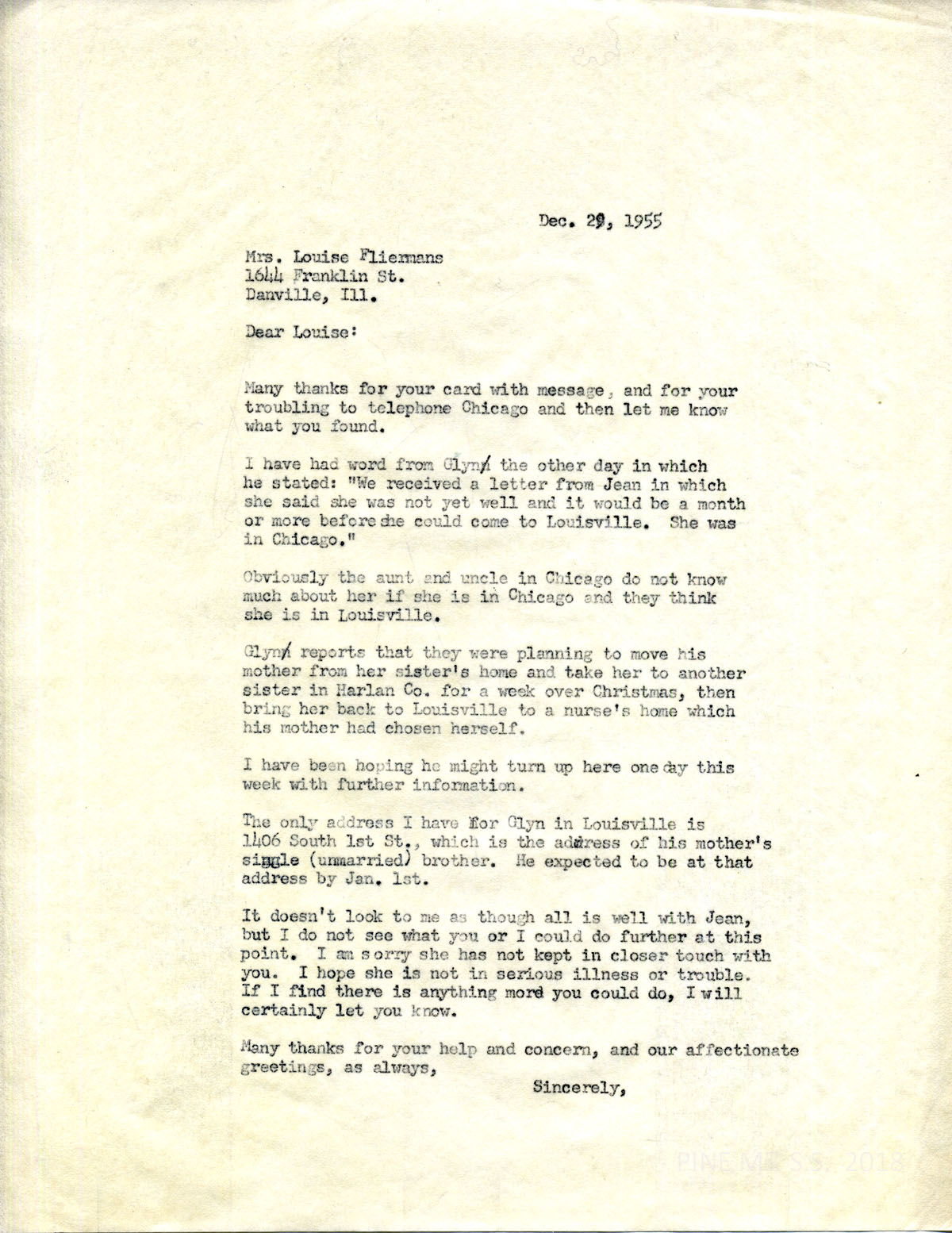 068 N.D. to Rogers from Fliermans, who called Jean’s relatives in Chicago who said Jean went to Louisville but they didn’t know Jean’s address. Fliermans wrote, ”I haven’t heard Jean for almost a yr.”