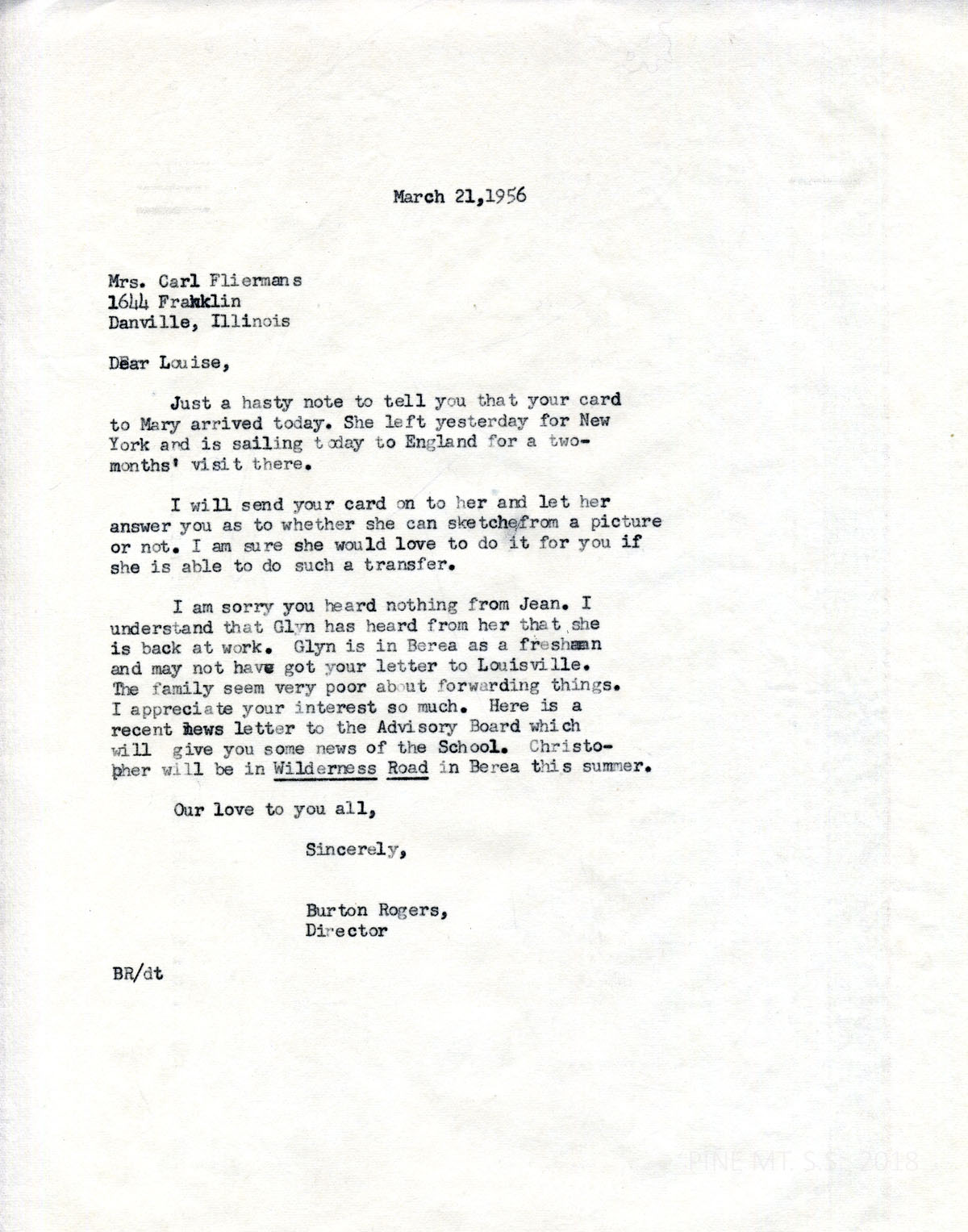 069 March 21, 1956. To Fliermans from Rogers, who will forward her card (asking for a sketch from a picture) to Mary Rogers in England. Glyn (now a Berea freshman) heard that Jean is ‘back at work.”