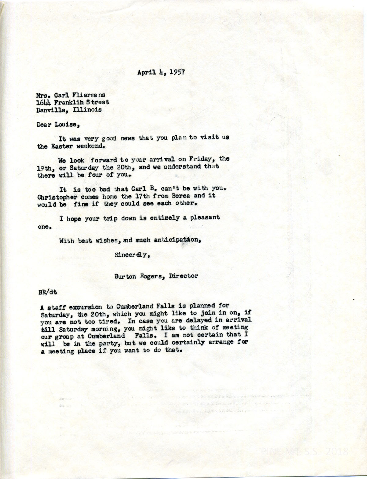 071 April 5, 1957. To Fliermans from Rogers, welcoming her to PMSS during Easter. He invites her to join a staff excursion to Cumberland Falls.