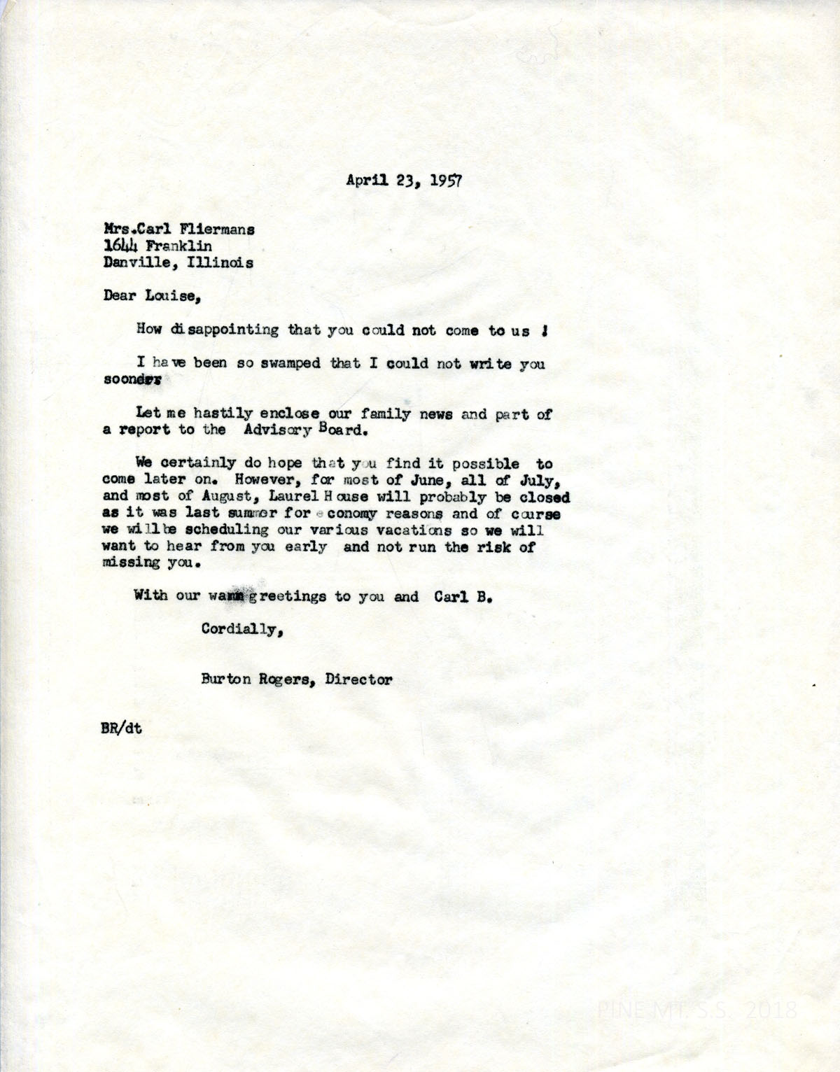 075 April 23, 1957. To Fliermans from Rogers, regretting that she cannot visit. He encloses part of an Advisory Board report. Laurel House will be closed for the summer “for economy reasons.”