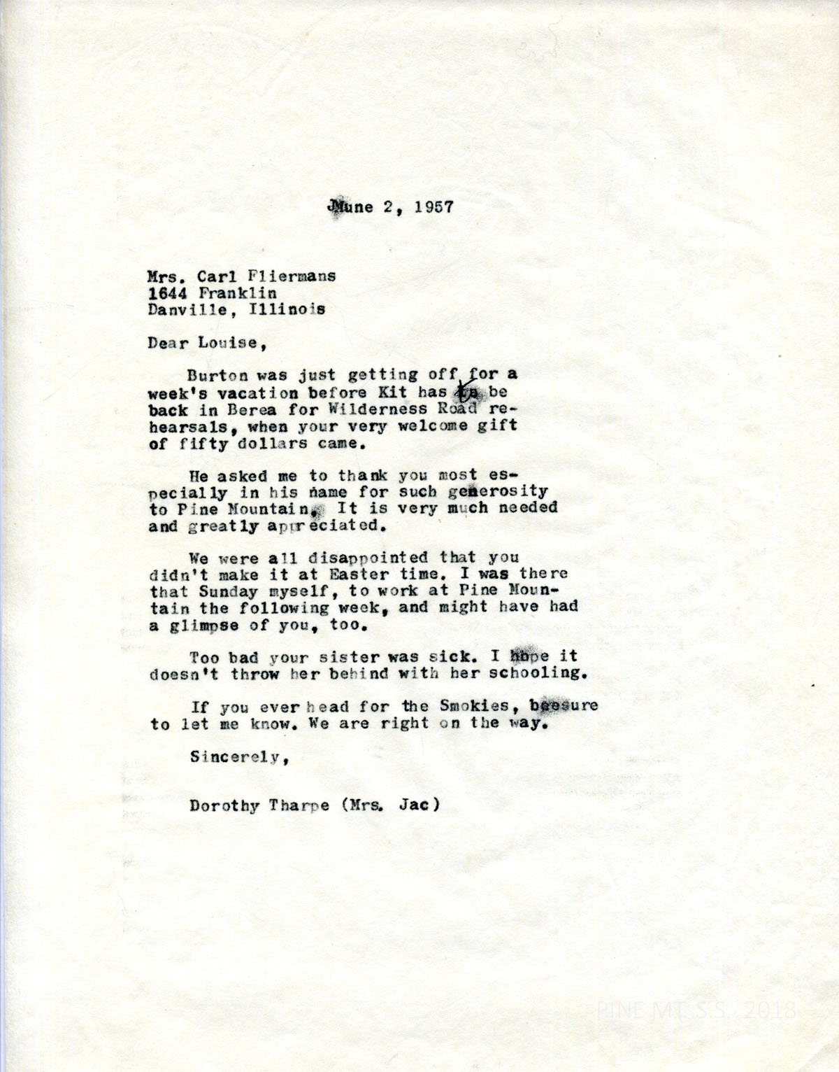 076 June 2, 1957. To Fliermans from Dorothy [Nace] Tharpe, thanking her for her donation and regretting Fleirmans couldn’t visit PMSS.