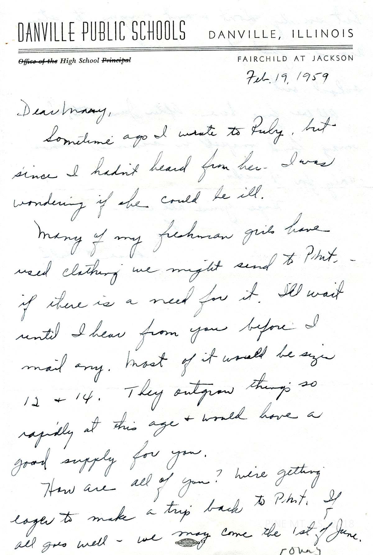 079-079a February 19, 1959. Two-page letter to Mary from Fliermans on “Danville Public Schools” letterhead, asking about Ruby who didn’t answer her letter. She offers to donate used clothing from her freshman girls.