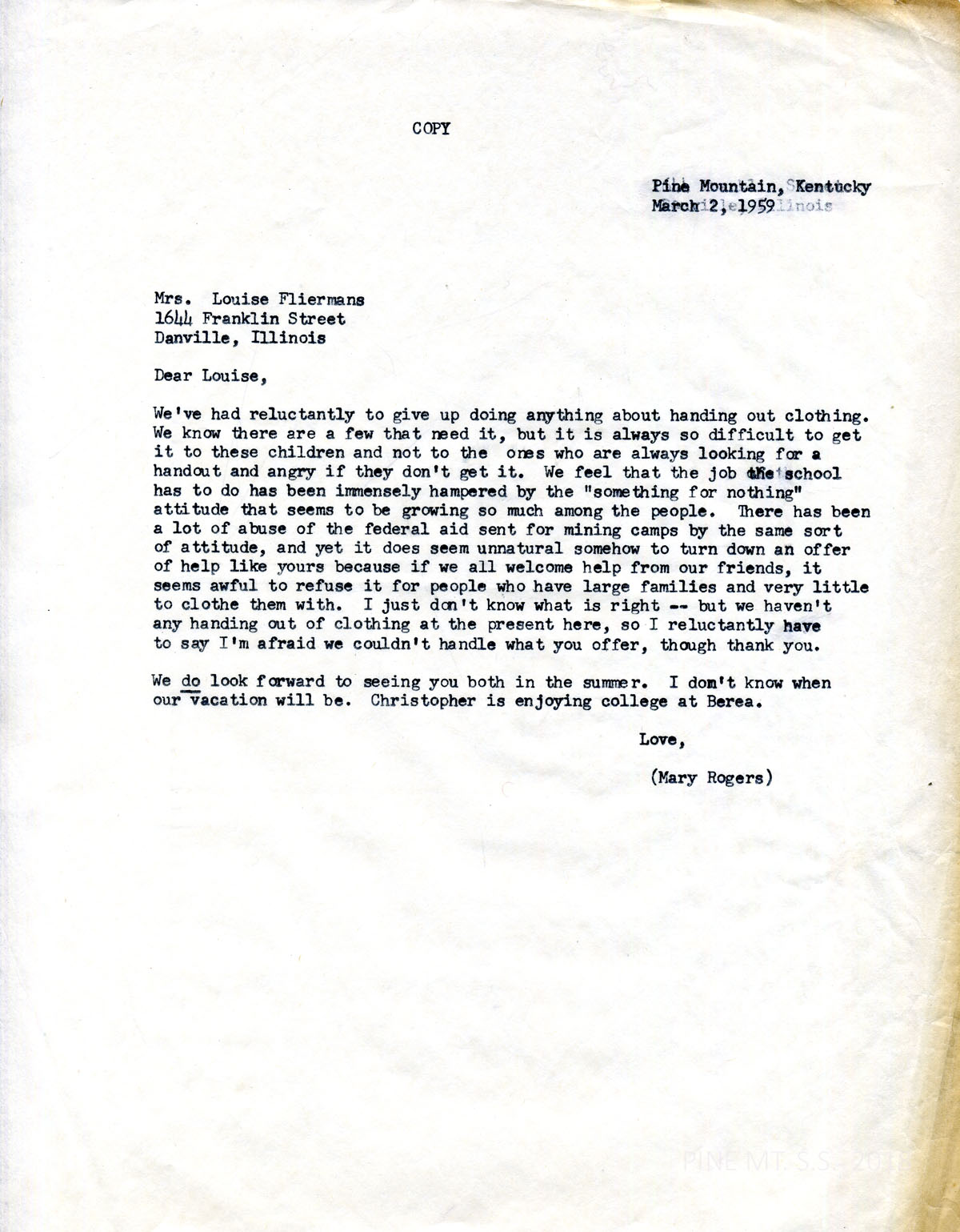 081 March 2, 1959. To Fliermans from Mary Rogers, explaining the School’s policy for used clothing donations: