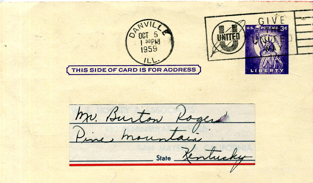 083 Address side of postcard to Rogers with date stamp: “October 5, 1959, Danville, Ill.”