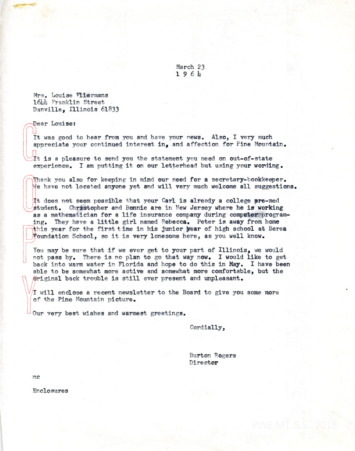 089 March 17, 1964. Typewritten letter to Rogers from Fliermans on letterhead for “Danville Public Schools.” “How I have wished many times that I could wave a magic wand and be back at Pine Mountain!” She will look for a suitable candidate for the secretary-bookkeeper opening. Carl is studying pre-med at Asbury College.