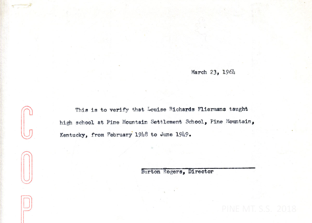 091 March 23, 1964. A verification from Rogers that “Louise Richards Fliermans taught high school at Pine Mountain Settlement School, Pine Mountain, Kentucky from February 1948 to June 1949.”