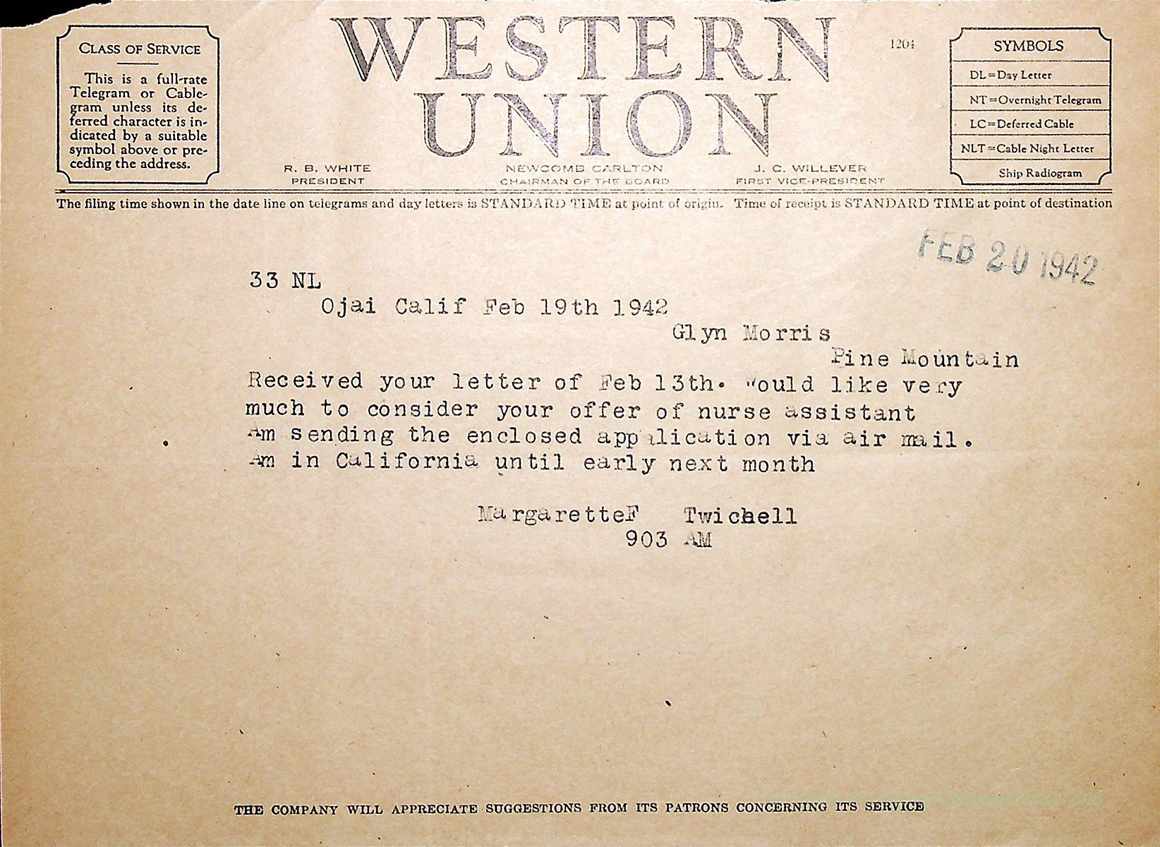 00015 (1) February 18, 1942. Western Union telegram to Glyn Morris from Margaret F. Twichell in Ojai, CA, who wishes to consider his offer of nurse assistant and is sending her application via air mail.