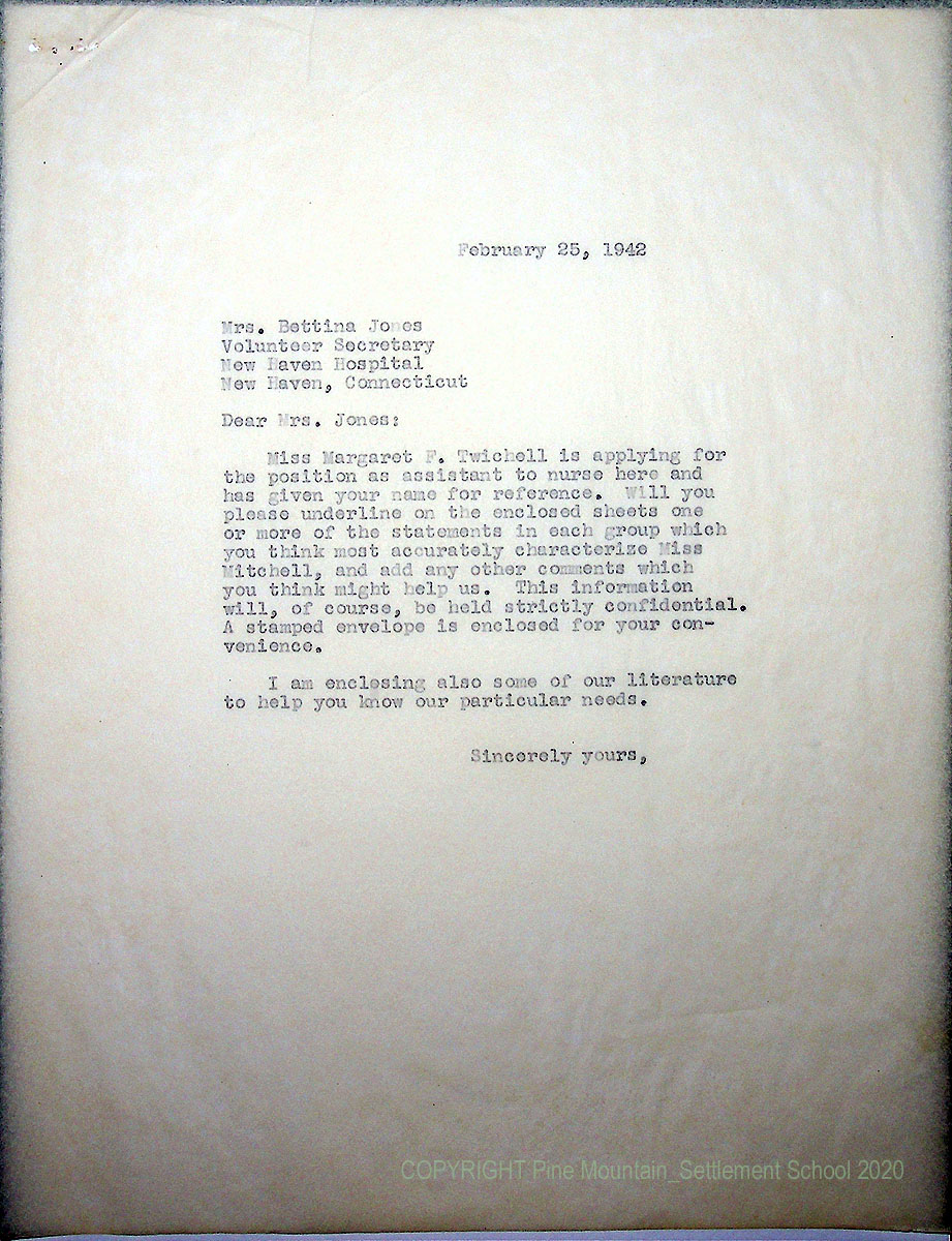 00015 (2) February 25, 1942. To Mrs. Bettina Jones, Secretary, at New Haven (CT) Hospital from [unsigned]. Asks Mrs. Jones to complete the enclosed sheets by indicating which statements most accurately characterize Miss Twichell.