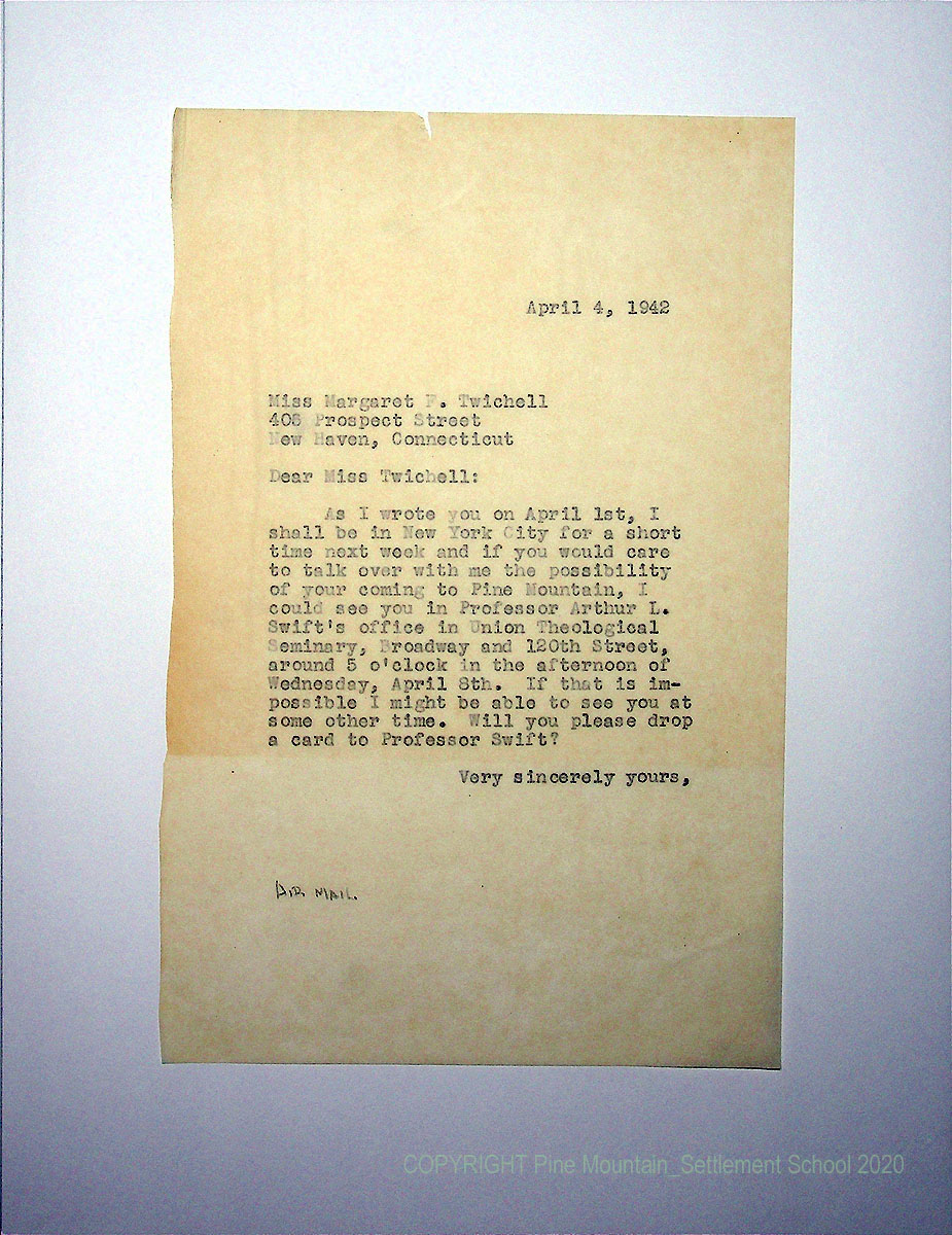 00015 (9) April 21, 1942. To Miss Barbara Gates, Smith College, Northampton, MA, from [unsigned], thanking her for sending a $10 check (in addition to her usual gift of $25) and for her “careful appraisal of Margaret Twichell…[It] is especially valuable because you know Pine Mountain and can see her in relation to it.” He plans to invite Twichell to the Kiwanis Camp to see if she likes PMSS; mentions that Mrs. [Berdina] Bishop may be in charge of the camp.