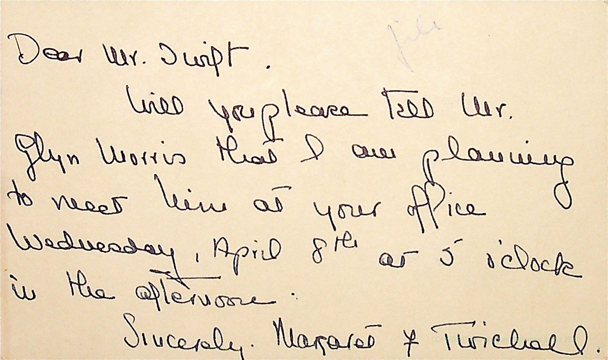00015 (6) April 4, 1942. Handwritten note on postcard to Mr. Swift from Margaret F. Twichell, who asks him to tell Morris about meeting in Swift’s office.