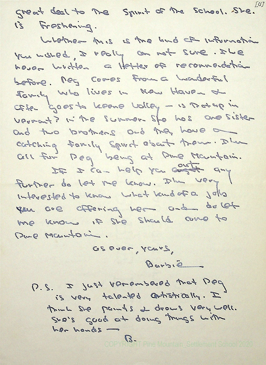 00015 (8) Handwritten two-page letter from “Barbie” to [IMAGE OF PAGE 1 IS MISSING]. Page 2. Letter of recommendation for “Peg” who “comes from a wonderful family who lives in New Haven and often goes to Keene Valley…in the summer. She has one sister and two brothers and they have a catching family spirit about them. I’m all for Peg being at Pine Mountain….Peg is very talented artistically.”