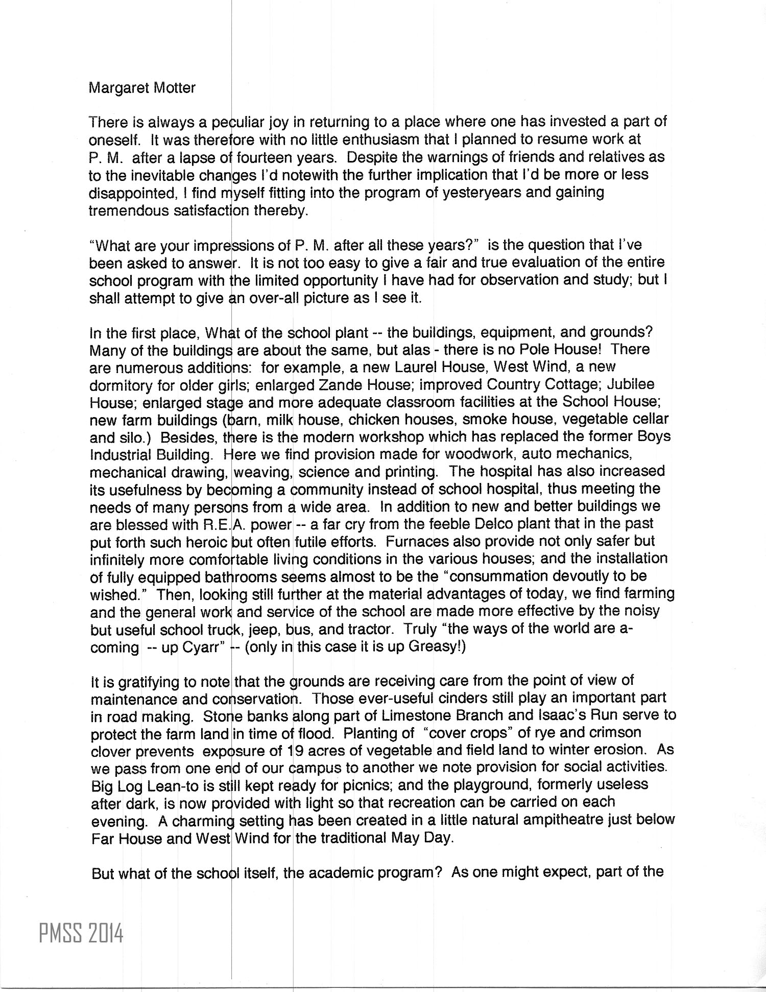 (This essay was probably written in 1946. Margaret Motter returned to work at PMSS 1946-1949 as English teacher and then office worker and publicity person. She had been a teacher and principal from 1928 to 1932.)
