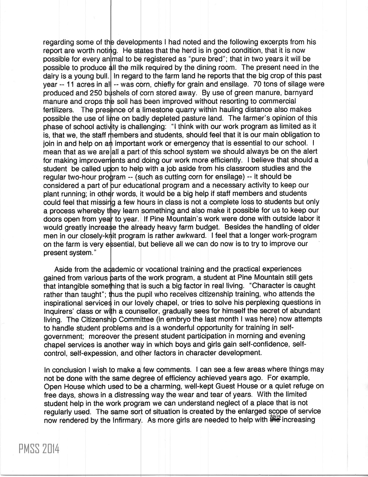 As P. M. consists of so much more than an academic school, being instead a settlement. I consider the work program as it fits into the entire set-up of basic importance. Two of our former students, now on the staff, evince a very cooperative spirit as they render service in their respective fields. I have talked with both of them and can see they serve so well because they believe in the School and appreciate what it has done for them. I asked the farmer [William Hayes] to give me a few facts