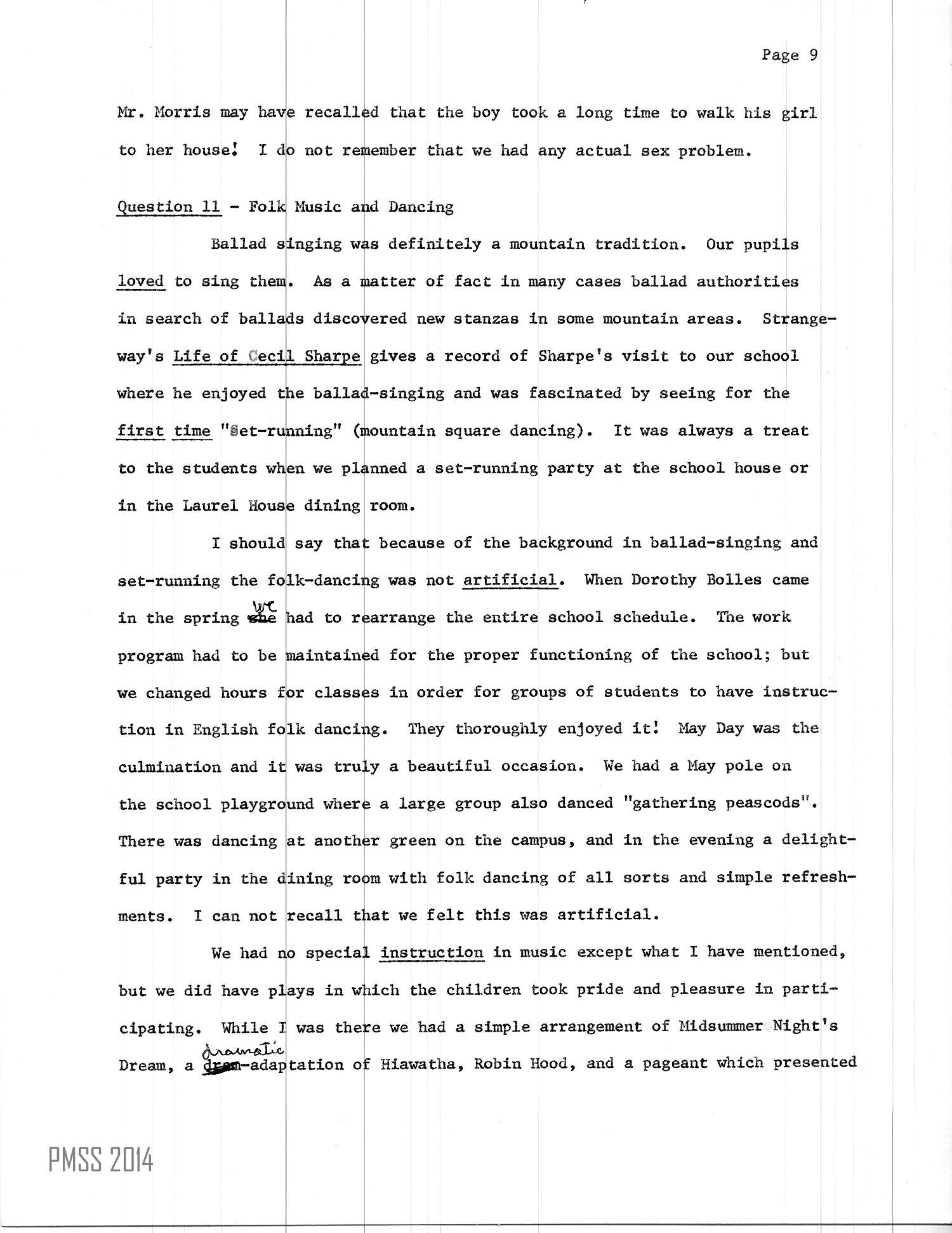 We had no special instruction in music except what I have mentioned, but we did have plays in which the children took pride and pleasure in participating. While I was there we had a simple arrangement of Midsummer Night’s Dream, dramatic adaptation of Hiawatha, Robin Hood, and a pageant which presented [page 10] the background and history of the school. We often dramatized ballads which the children called “play acting.”