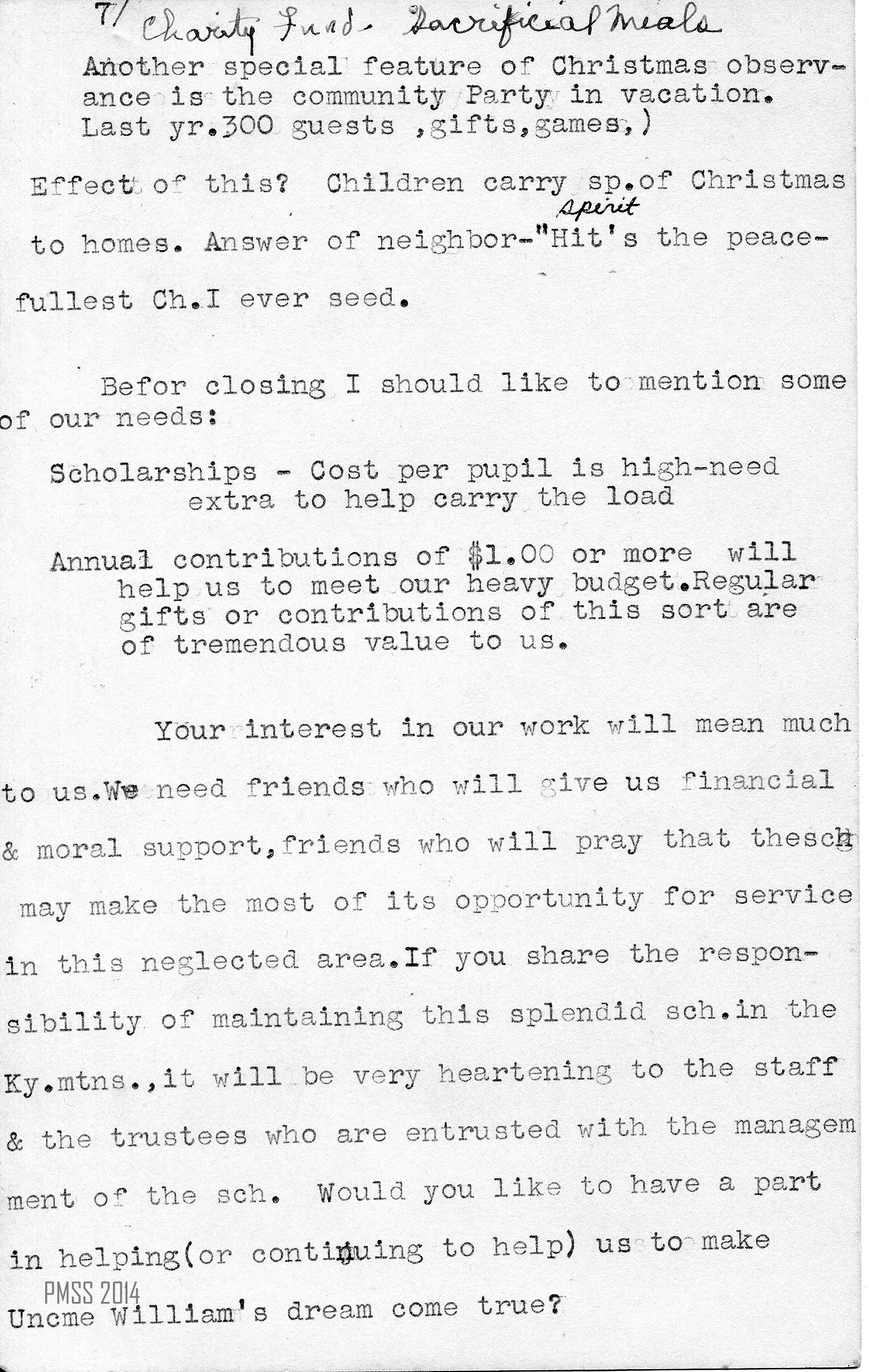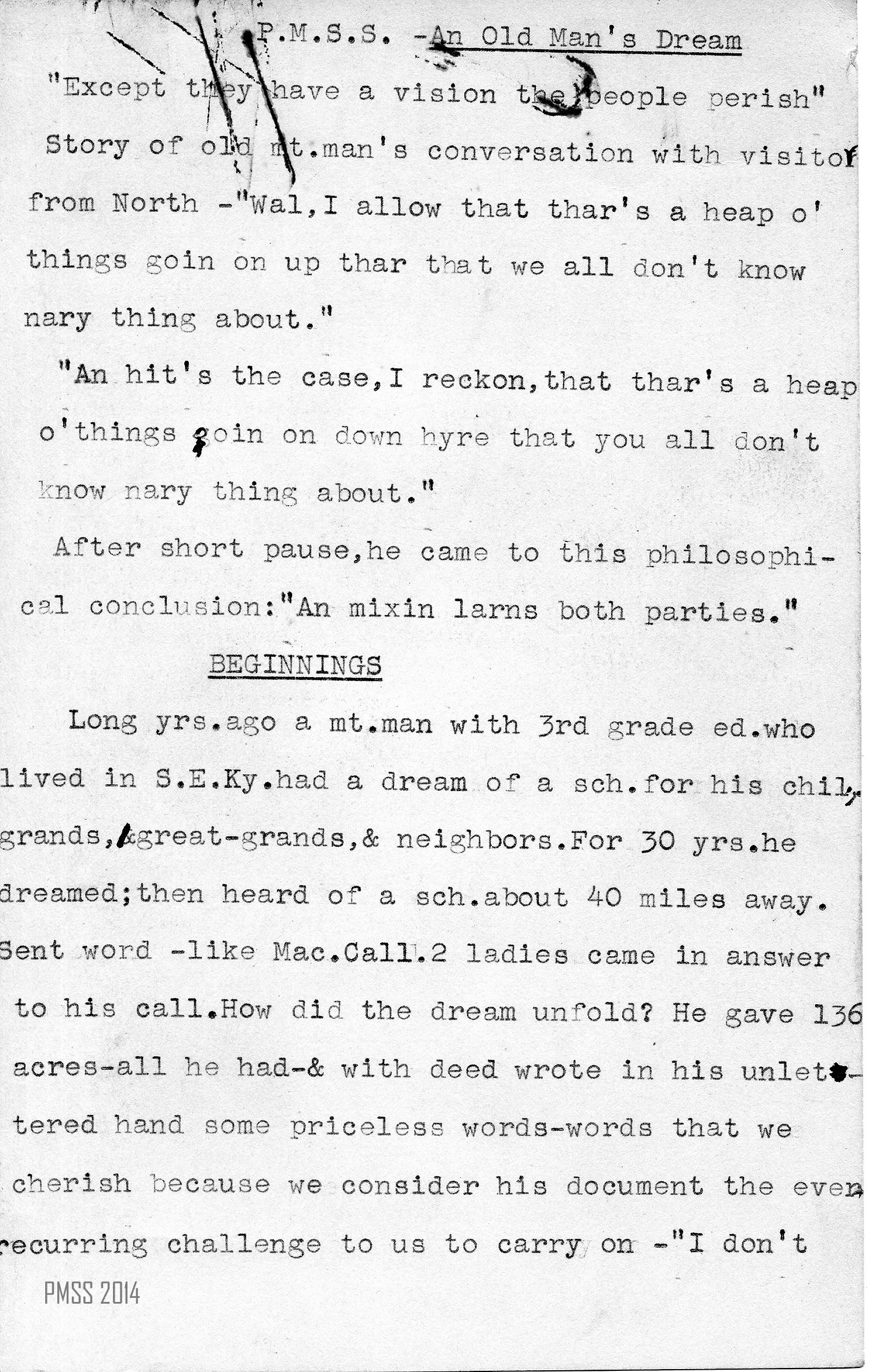 Long years ago a mountain man with a third grade education who lived in South Eastern Kentucky had a dream of a school for his children, grands, great-grands, and neighbors. For thirty years he dreamed; then he heard of a school about forty miles away. [He] sent word — [like MacCall ?] and two ladies came in answer to his call. How did the dream unfold? He gave 136 acres — all he had & with deed wrote in his unlettered hand some priceless words — words that we cherish because we consider his document the ever recurring challenge to us to carry on —