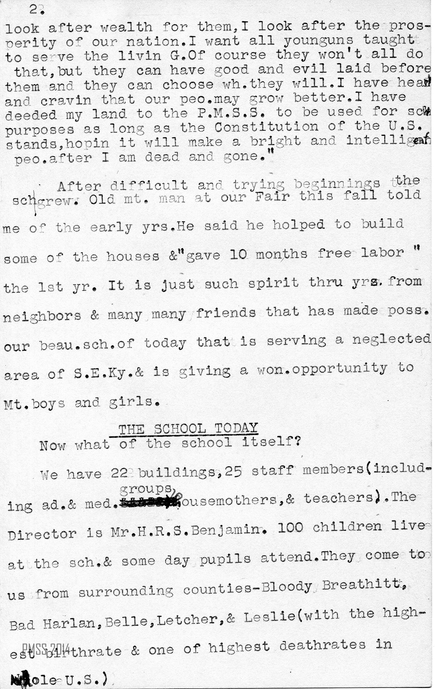 We have 22 buildings, 25 staff members (including administration, medical groups, housemothers, and teachers). The Director is Mr. H.R.S Benjamin. 100 children live at the school and some day pupils [also] attend. They come to us from surrounding counties — Bloody Breathitt, Bad Harlan, Belle [sic], Letcher, and Leslie (with the highest birthrate and one of the highest death rates in the whole United States.)