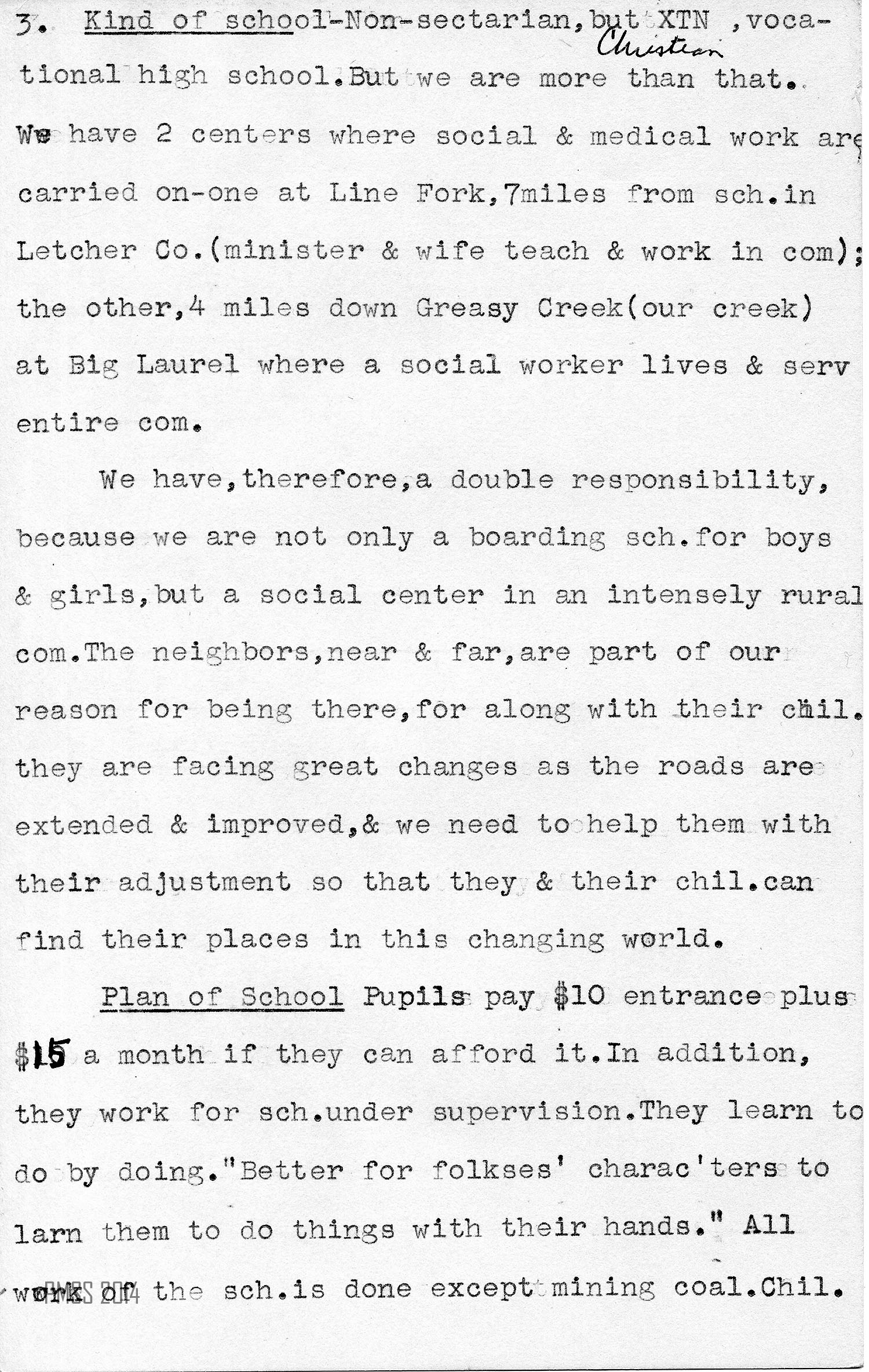 [the school is] non-sectarian, but Christian, vocational high school. But we are more than that. We have two centers where social and medical work are carried on — one at Line Fork, 7 miles from school in Letcher County (minister and wife teach and work in community [Richard and Lutrella Baker] and the other four miles down Greasy Creek (our creek) at Big Laurel where a social worker lives and serves entire community.