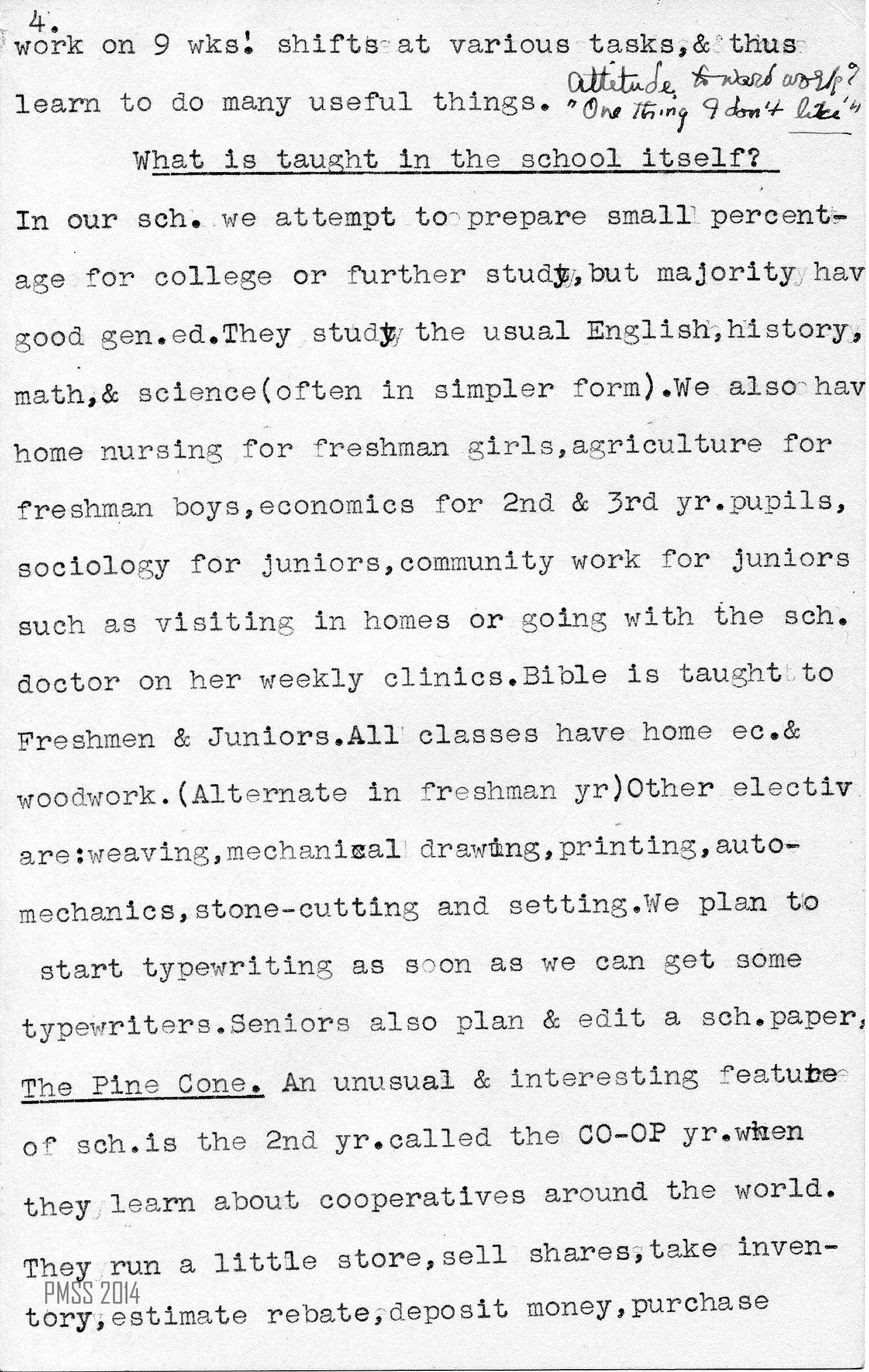 In our school we attempt to prepare [a] small percentage for college or further study, but [the] majority have good general education. They study the usual English, history, math, and science (often in simpler form). We also have home nursing for freshman girls, agriculture for freshman boys, economics for 2nd and 3rd year pupils, sociology for juniors, community work for juniors such as visiting in homes or going with the school doctor on her weekly clinics. Bible is taught to Freshmen and Juniors. All classes have home economics and woodwork. (Alternate in freshman year) Other electives are: weaving, mechanical drawing, printing, auto-mechanics, stone-cutting and setting. We plan to start typewriting as soon as we can get some typewriters. Seniors also plan and edit a school paper, The Pine Cone. An unusual and interesting feature of school is the 2nd year called the CO-OP year when they learn about cooperatives around the world. They run a little store, sell shares, take in [image 005, page 5] food and other supplies.