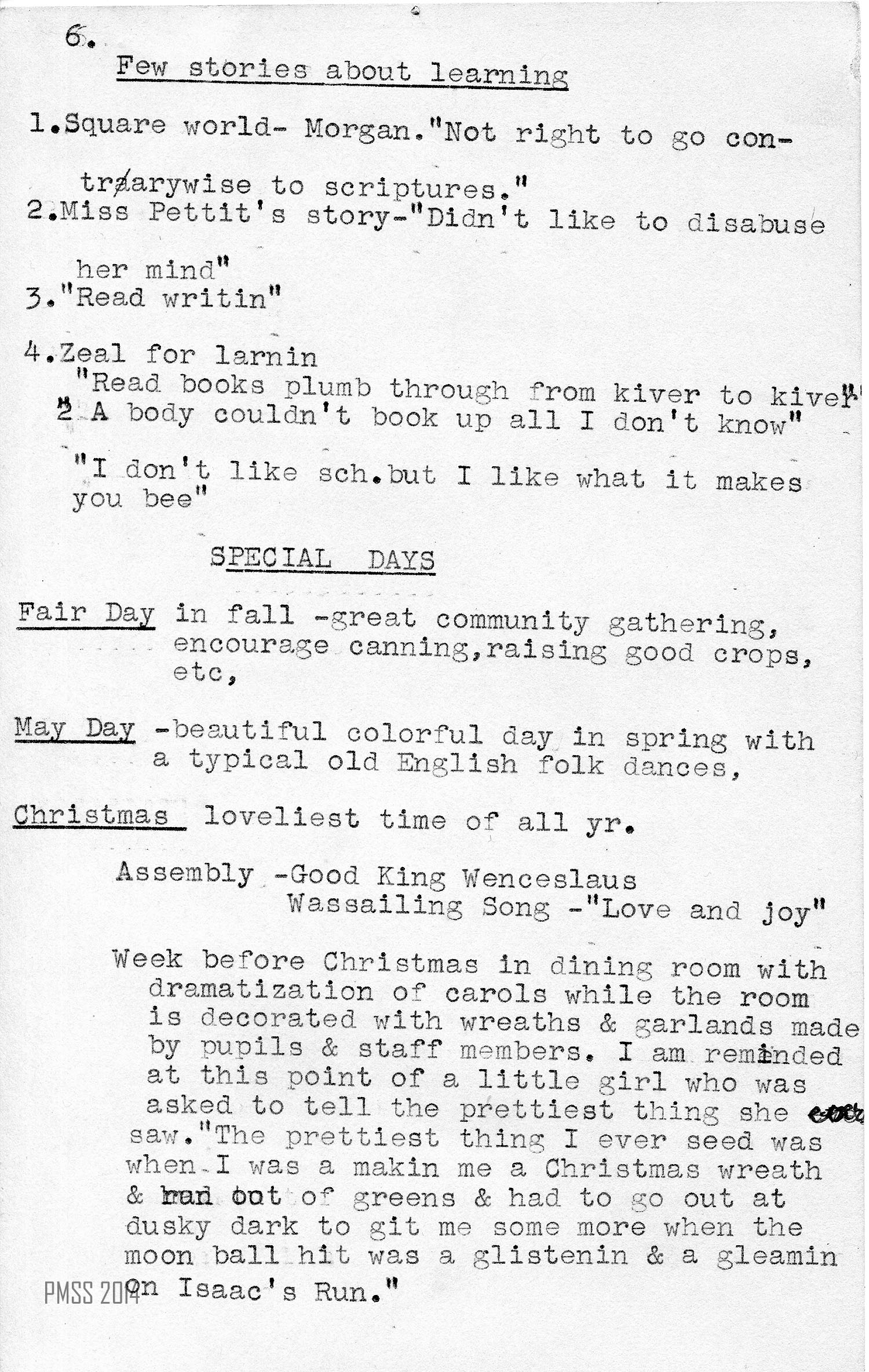 Week before Christmas in dining room with dramatization of carols while the room is decorated with wreaths and garlands made by pupils and staff members. I am reminded at this point of a little girl who was asked to tell the prettiest thing she saw. “The prettiest thing I ever seed was when I was a makin’ me a Christmas wreath and run out of greens and had to go out at dusky dark to git me some more when the moon ball hit was a glistenin’ and a gleamin’ on Isaac’s Run.”