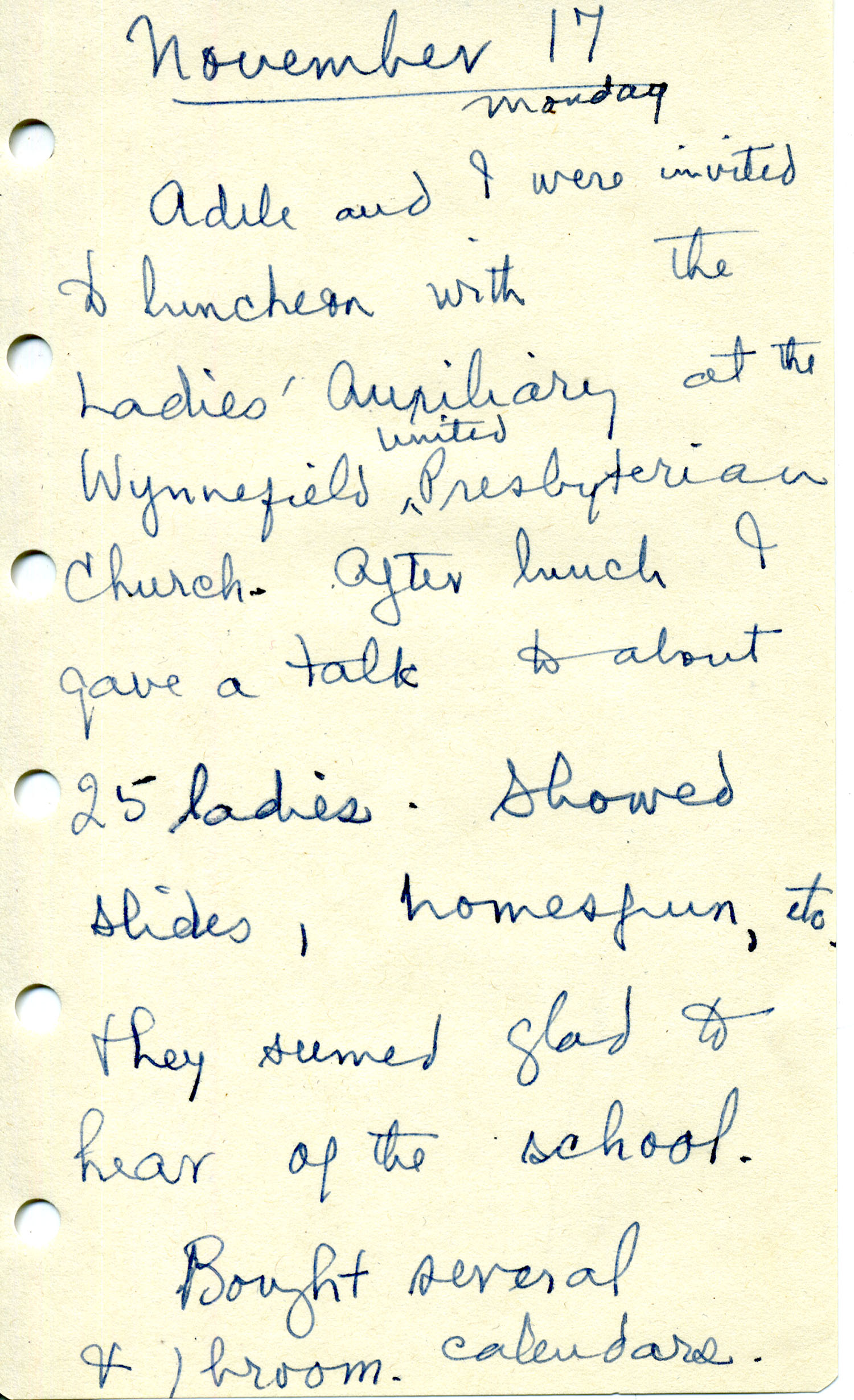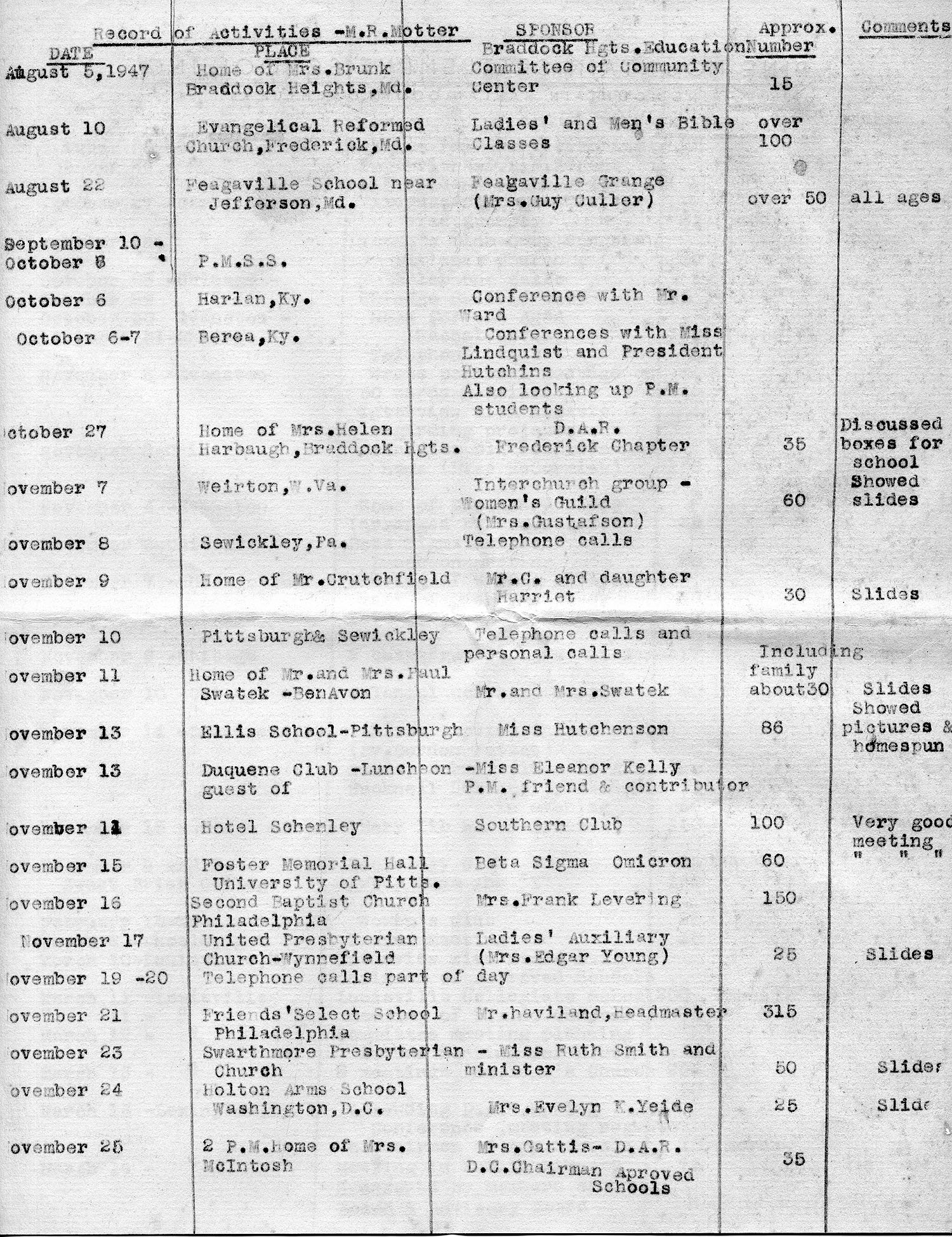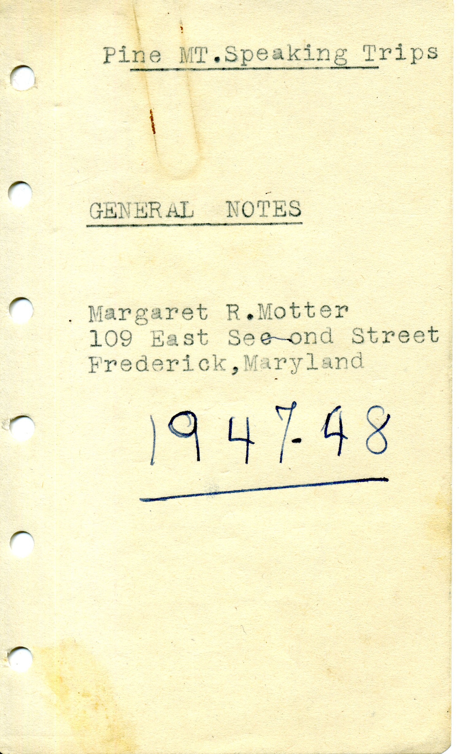 From late 1946 through 1949 Margaret Motter was given the responsibility of representing Pine Mountain Settlement School to the broader communities of interest, mainly the Northeast. She traveled to major metropolitan areas as well as towns that had Pine Mountain connections, to give short talks and to show slides of the institution. She carefully kept a record of her visits and in some cases copies of her remarks about the School. This record provides a unique opportunity to look back at the School through the development mantra of the institution. The records are also testimony to the broad ranging contacts the School maintained through the 1940s.