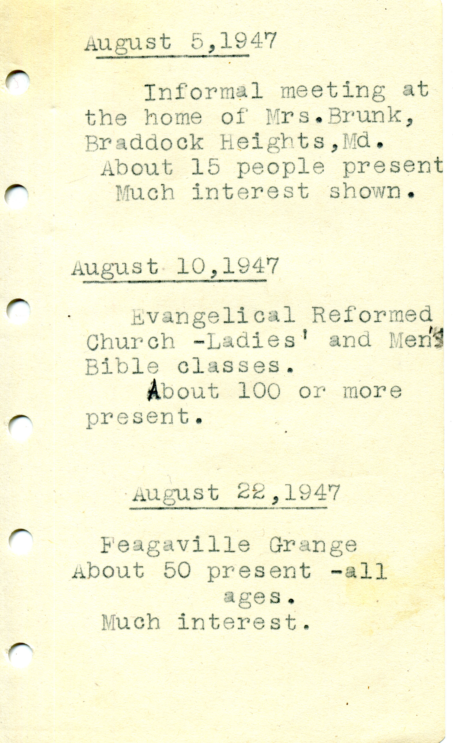 | August 5, 1947 | Home of Mr. Brunk, Braddock Heights, Md. | Braddock Hgts. Education Committee of Community Center | 15 | |