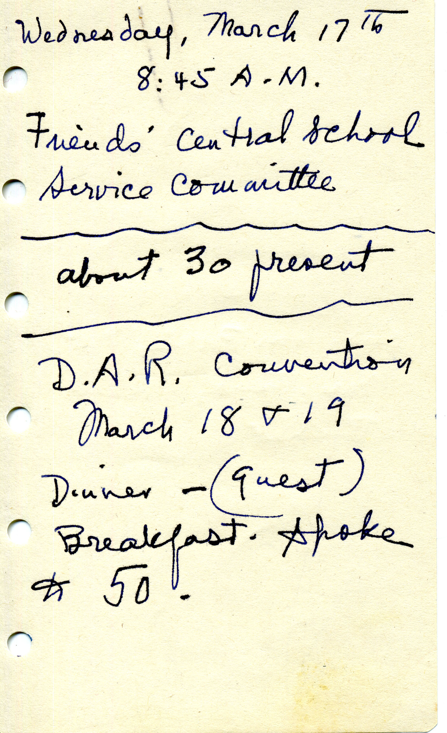 | February 24 | Personal visit in Philadelphia | Conference with Miss Kathryn Post regarding future meeting in West Collingswood, N.J. | ||