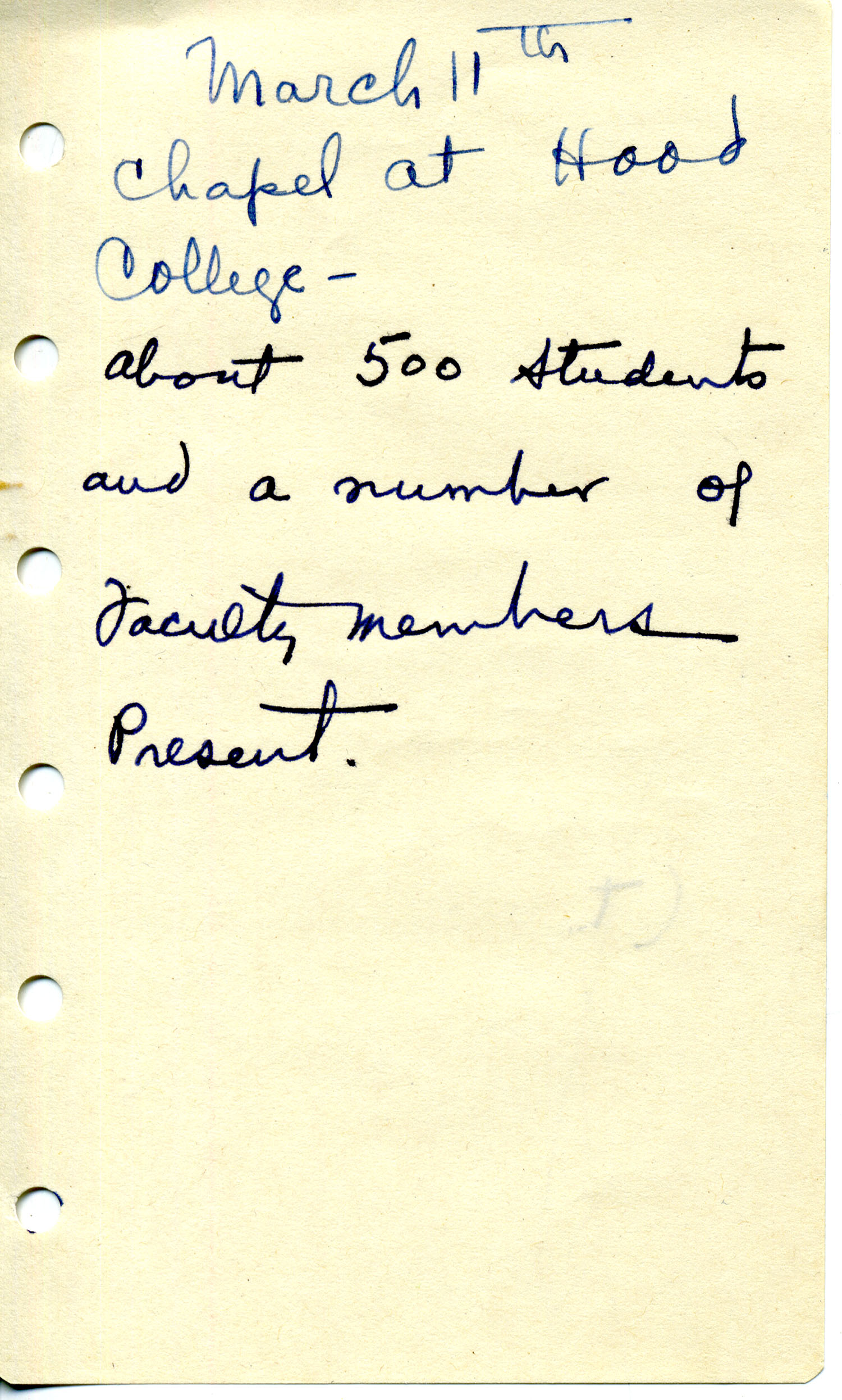 | March 11 | Hood College, Frederick, Md. | Dr. Henry I. Stahr | 500 | |