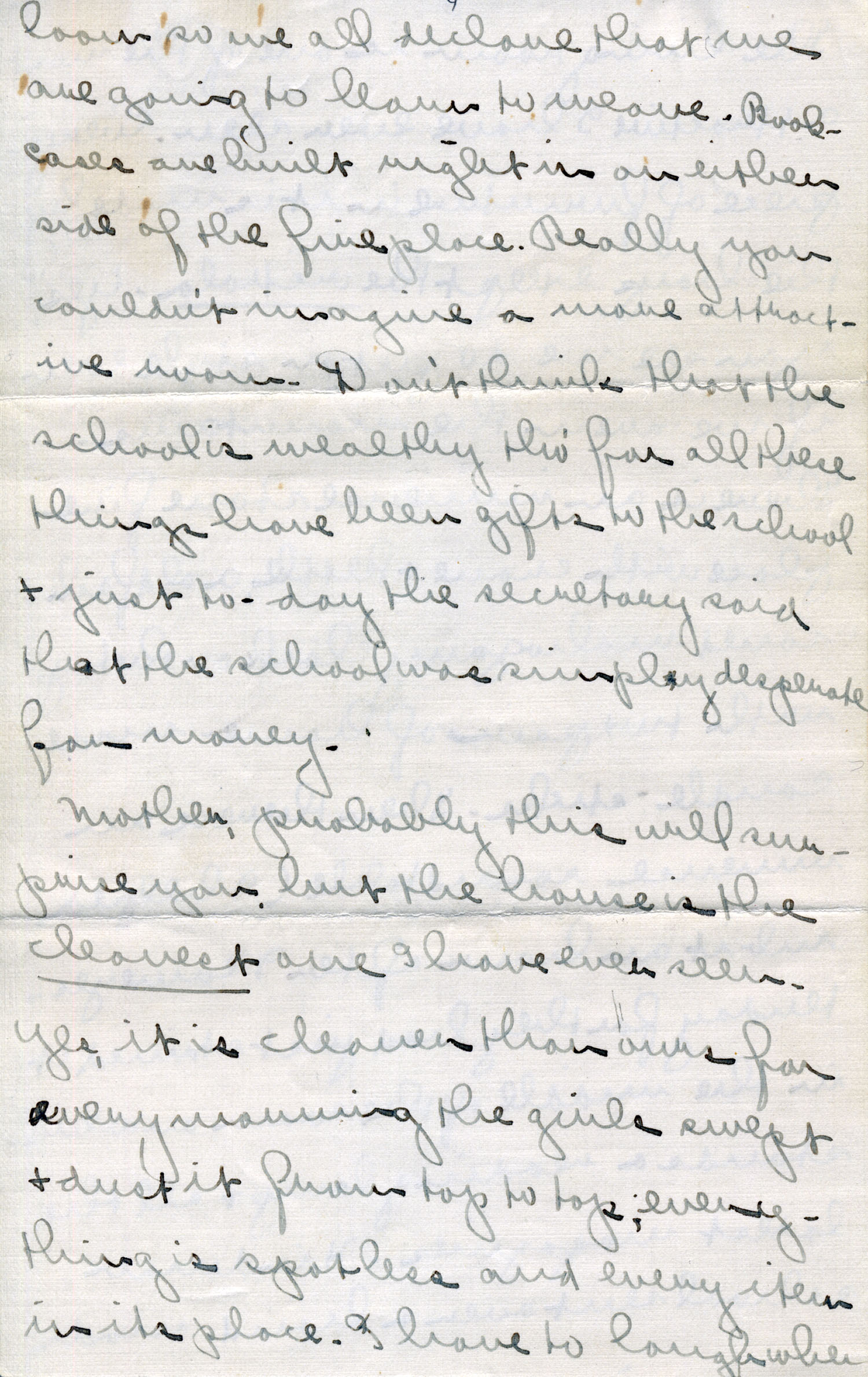 Miss Watts and I have decided to have this room as our living room and both sleep on the sleeping porch. I hope Mother that you won’t worry about me down here for I am as safe as I would be at Vassar College.