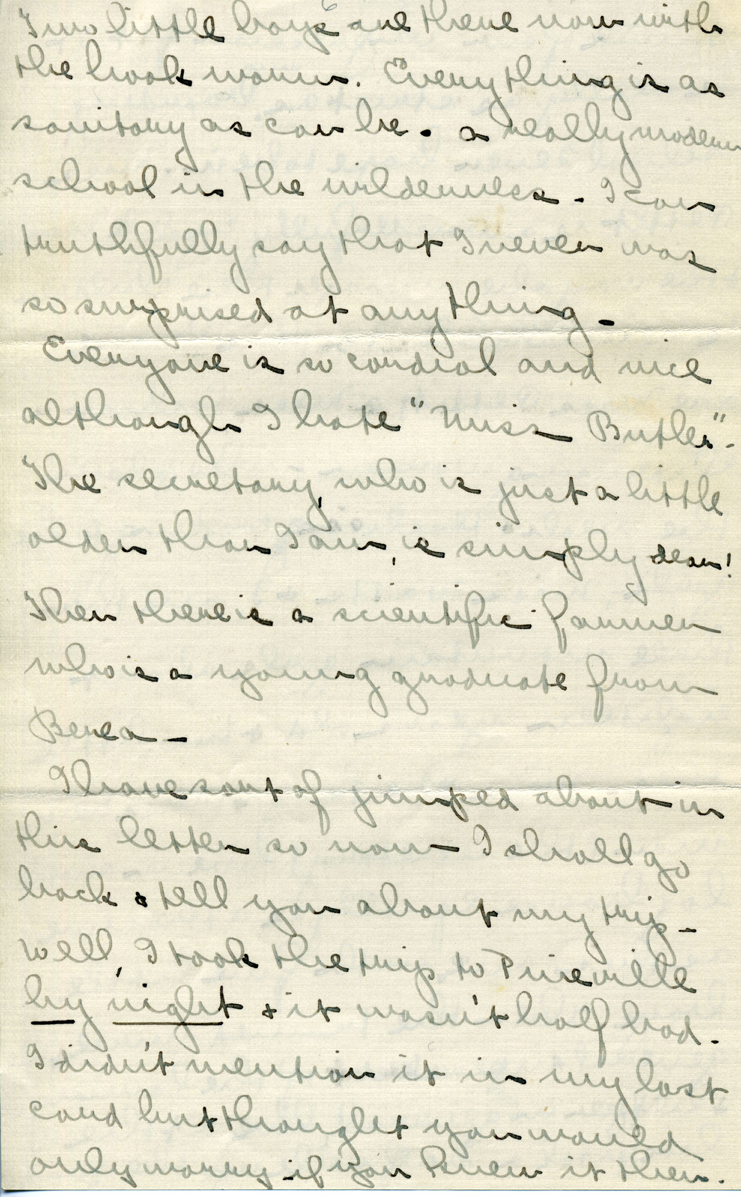 Everyone is so cordial and nice although I hate “Miss Butler”. The secretary, who is just a little older than I am, is simply dear! Then there is a scientific farmer who is a young graduate from Berea.
