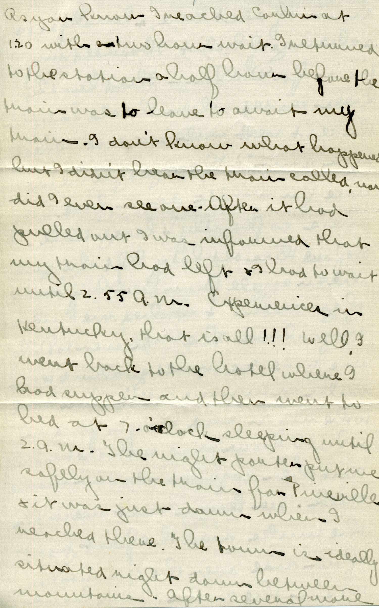 I have sort of jumped about in this letter so now I shall go back and tell you about my trip. Well, I took the trip to Pineville by night and it wasn’t half bad. I didn’t mention it in my last card but thought you would only worry if you knew it then. As you know, I reached Corbin at 1:20 with a two hour wait. I returned to the station a half hour