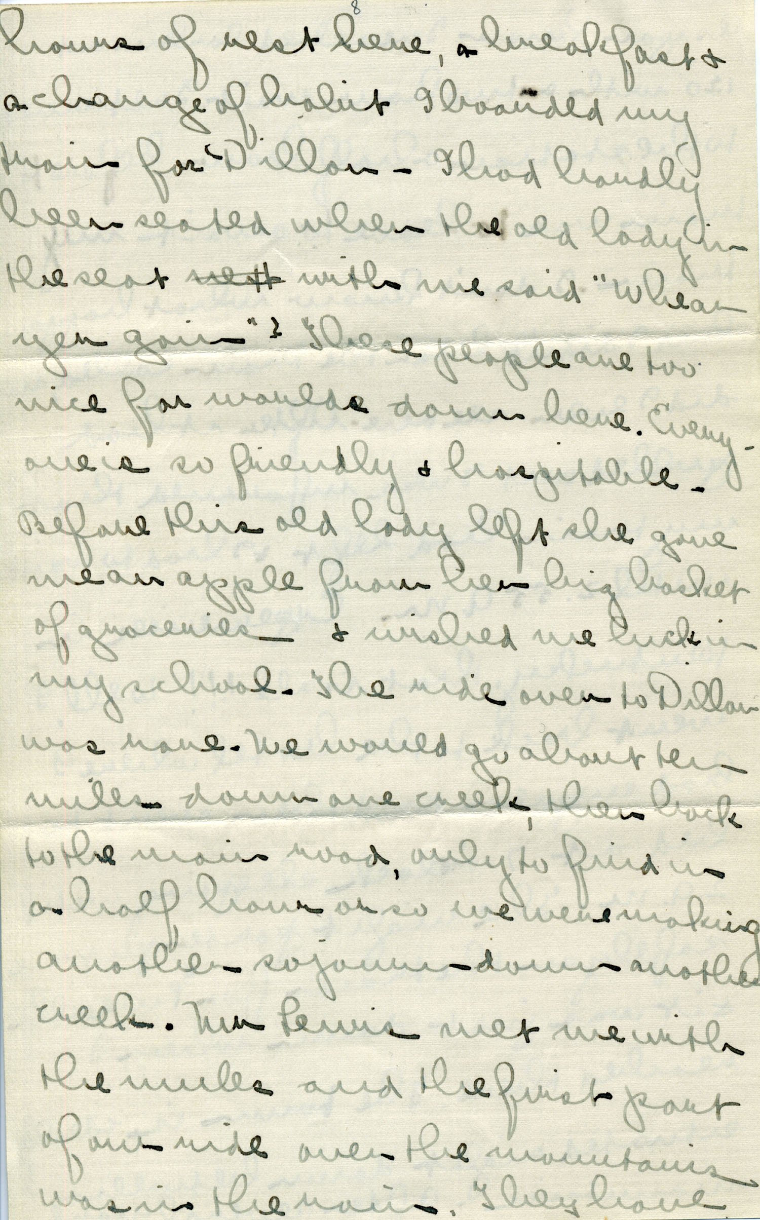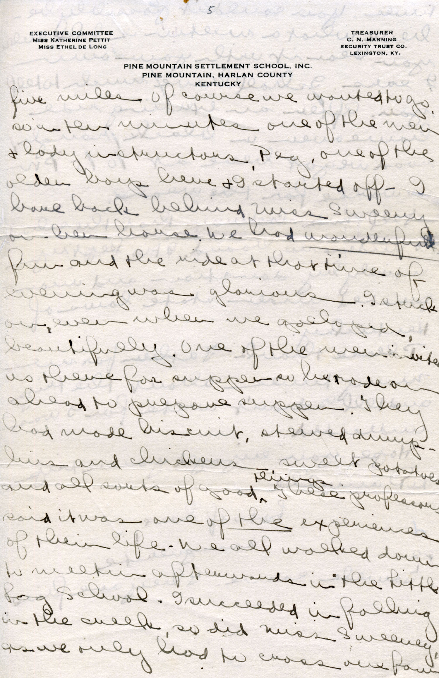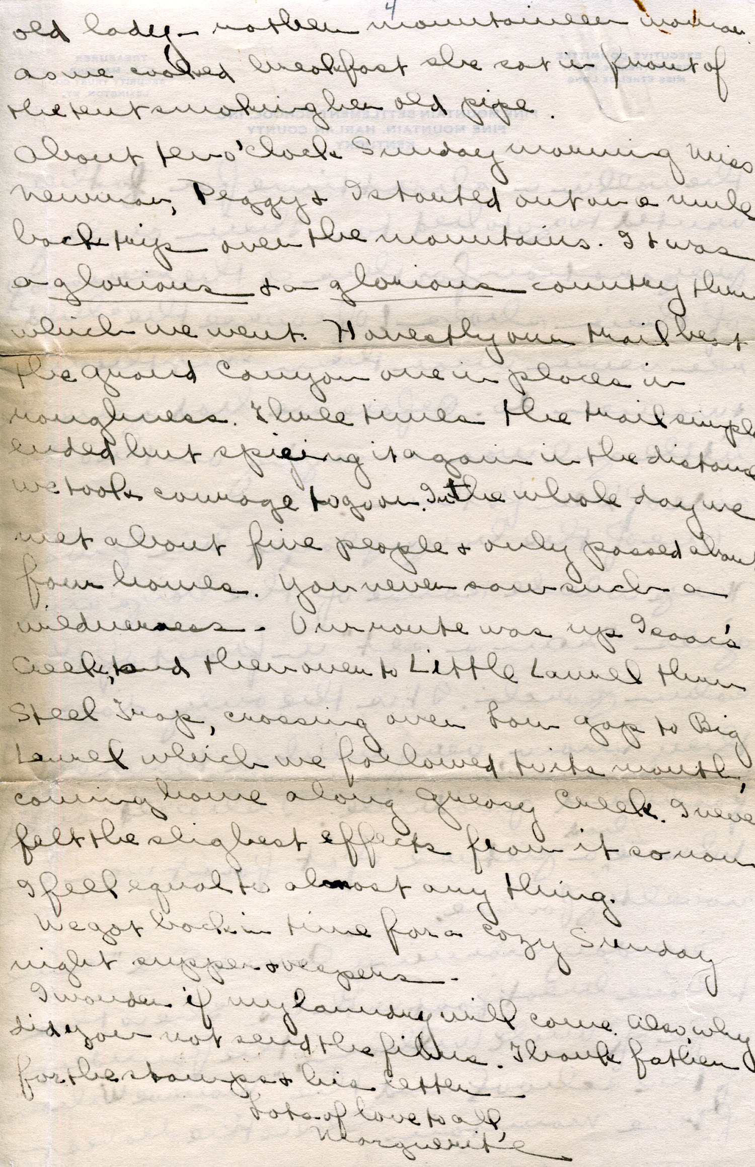 About ten o’clock Sunday morning Miss Newman, Peggy and I started out on a muleback trip over the mountains. It was a glorious [?] and a glorious country through which we went. Honestly, our trail beat the Grand Canyon one in places in roughness. Three times the trail simply ended, but spying it again in the distance we took courage to go on. In the whole day we met about five people and only passed about four houses. You never saw such a wilderness. Our route was up Isaac’s Creek, and then over to Little Laurel through Steel Trap, crossing over Low Gap to Big Laurel which we followed to its mouth, coming home along Greasy Creek. I never felt the slightest effects from it so now I feel equal to almost anything.