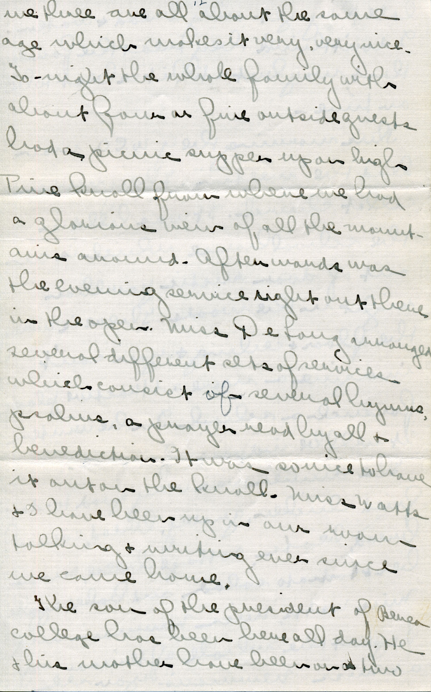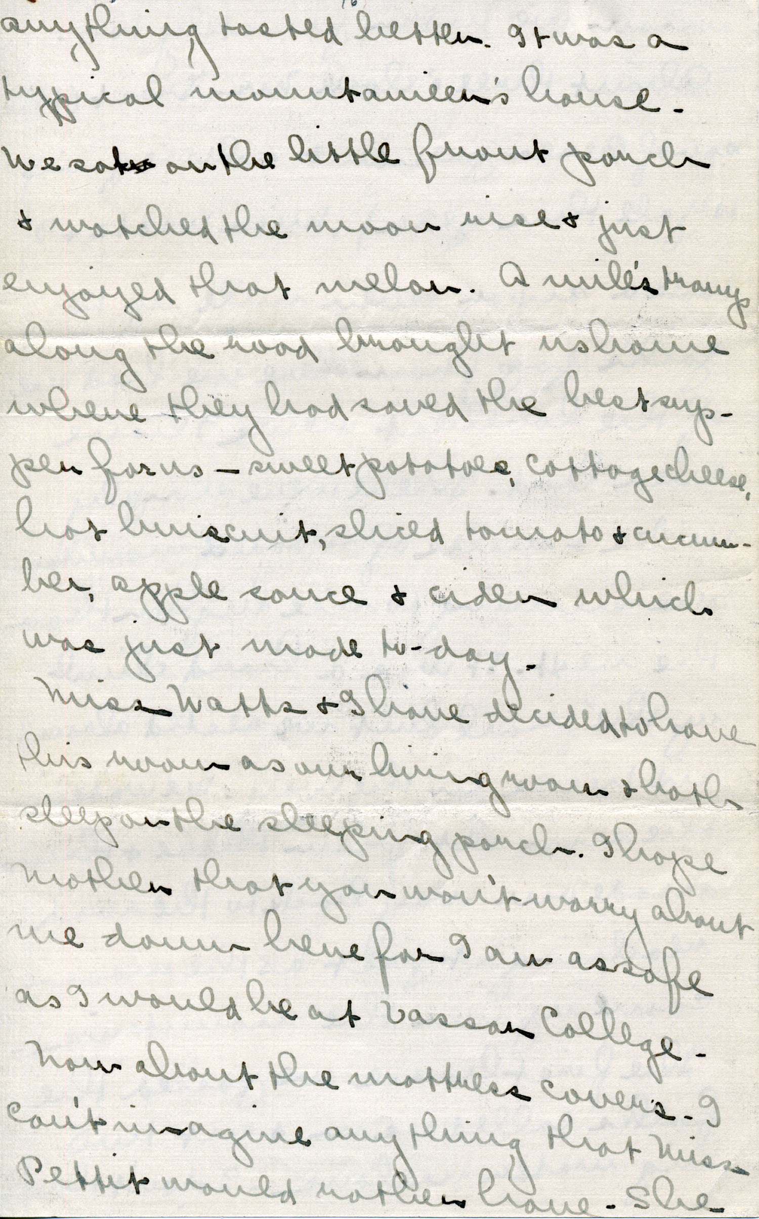 About three o’clock Mr. Frost (the son of Berea president who is going to Yale this year), Miss Watts and I took a six or seven mile [hike] _______ up to Jack’s Gap where we had one of the loveliest views I have ever had. There were simply miles and miles of wooded mountains, one seeming to rise higher than the rest. It was a hard climb up the trail but we rested about six times on the way. We watched the sunset from there and then made our way back to the road reaching it just as the moon came up over the mountains. The first house we passed the folks called us in and cut two big watermelons. I don’t think anything tasted better. It was a typical mountaineer’s house. We sat on the little front porch and watched the moon rise and just enjoyed that melon. A mile’s tramp along the road brought us home where they had saved the best supper for us – sweet potatoes, cottage cheese, hot biscuit, slice tomato and cucumber, apple sauce and cider which was just made today.